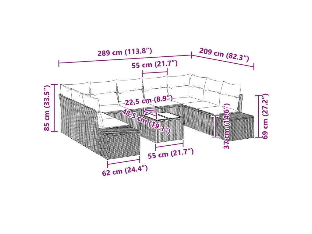 - 2 x Boční pohovka: 55 x 55 x 37 cm (D x Š x V)