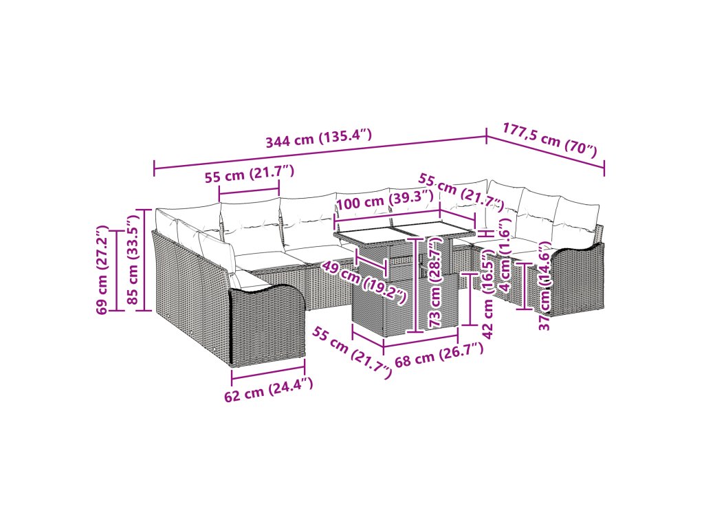 Odolné materiály: Set je z poly ratanu, takže vypadá skvěle a vydrží. Práškově lakovaný ocelový rám zajišťuje silnou oporu, i v náročných podmínkách. Polyesterové polštáře jsou pohodlné a zároveň trvanlivé. Kompletní komponenty setu: Obsahuje rohové a středové sedáky, arm pohovky a multifunkční stůl. Temperované sklo na stole přidává elegance a zachovává funkčnost. Funkční vlastnosti: Výška stolu se snadno mění, takže ho využijete jako konferenční i jídelní stůl. Lehký design usnadňuje přesun, zatímco UV-odolné materiály chrání před sluncem. Univerzální využití: Skvělý pro lenošení nebo hosty. Set je navržen pro venkovní prostory a jeho moderní styl padne do jakéhokoliv prostředí. Údržba a péče: Používáním krytu, když set není v užívání, ochráníte jeho vzhled proti povětrnostním vlivům. Sestavení vyžaduje dva lidi a šroubovák.- Barva: Černá