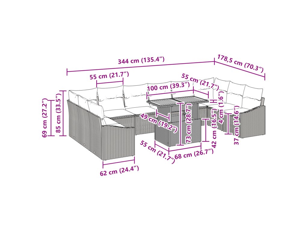 Prémiové materiály: Vyrobeno z vysoce kvalitního poly ratanu, robustní práškově lakované oceli a masivního akáciového dřeva, je tato jídelní souprava navržena tak, aby odolávala různým povětrnostním podmínkám a zároveň nabízela sofistikovaný vzhled. Materiály jsou vybrány pro svou pevnost, dlouhověkost a nízké nároky na údržbu, což zajišťuje, že váš venkovní prostor zůstane stylový. Komplexní komponenty: Tato souprava zahrnuje složitě navržená armová sofa a rohové sedáky se skrytým úložným prostorem, což poskytuje funkčnost a styl. Robustní zahradní stůl doplňuje sezení, vše pečlivě vyrobené pro plynulé začlenění do zahrady nebo terasy. Inovativní designové prvky: Modulární design umožňuje přeconfigurování, aby vyhovoval shromážděním všech velikostí. Prvky, jako nastavitelné nohy, zajišťují stabilitu a přizpůsobivost na různých terénech, zatímco manuální přizpůsobení přidává prvek osobního pohodlí. Každý díl je navržen jak pro využití, tak pro eleganci. Univerzální využití: Perfektně se hodí do venkovních prostor jako terasy, dvory nebo zahrady, tato jídelní souprava zve k celoročnímu užívání, přizpůsobuje se jak na párty, tak na klidné odpolední čaje. Jejím vkusem design ladí s jakýmkoliv dekorem, zatímco lehká konstrukce usnadňuje mobilitu a předělávání. Praktická péče: Snadná údržba a čištění, tato zahradní souprava vyžaduje jen jednoduché otření suchým hadříkem k odstranění prachu. Pro zachování její bezvadného stavu je lepší používat voděodolný obal během extrémního počasí. Každý polštář je vybaven zipem pro snadné odstranění a pravidelné větrání.- Barva: Beige a šedá