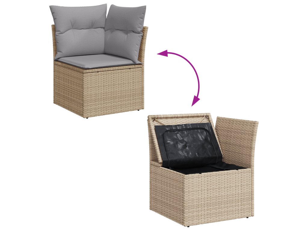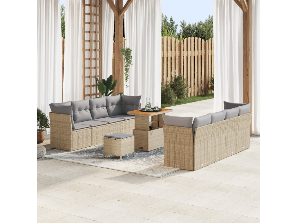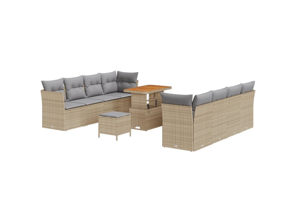Materiály: Z prémiového poly ratanu, který vypadá moderně, a zároveň je odolný vůči UV záření a vodě. Poly ratan doplňuje akáciové dřevo, což dává setu přírodní vzhled a dlouhou životnost. Skvělá volba pro zachování vizuální i fyzické kvality soupravy. Součásti: Pohodlné opěradlo z poly ratanu a polstrovaná sedadla z polyesteru, která se snadno udržují díky zipu. Rám z práškované oceli je pevný a lehký, což usnadňuje přesouvání. Všechny části jsou navrženy pro pohodlí a podporu aktivního venkovního stylu. Vlastnosti: Set obsahuje stůl s nastavitelnou výškou, která se jednoduše mění mezi kávovým a jídelním stolem. Skryté úložné prostory přispívají k celkovému stylu a pohodlí, ideální pro společenské akce i soukromé chvíle. Doporučené použití: Ideální pro zahrady a terasy, hodí se pro klidné chvíle nebo rodinné brunch na slunečných dnech. Moderní design krásně sedí v různých prostředích, je skvělým doplňkem každé venkovní akce. Údržba: Ochráníte svou investici krytem, když nábytek nepoužíváte. Pravidelně čistěte šetrně, abyste udrželi materiály v dobrém stavu. Snadná péče zajistí radost na všechny sezóny.- Barva: Béžová a světle šedá