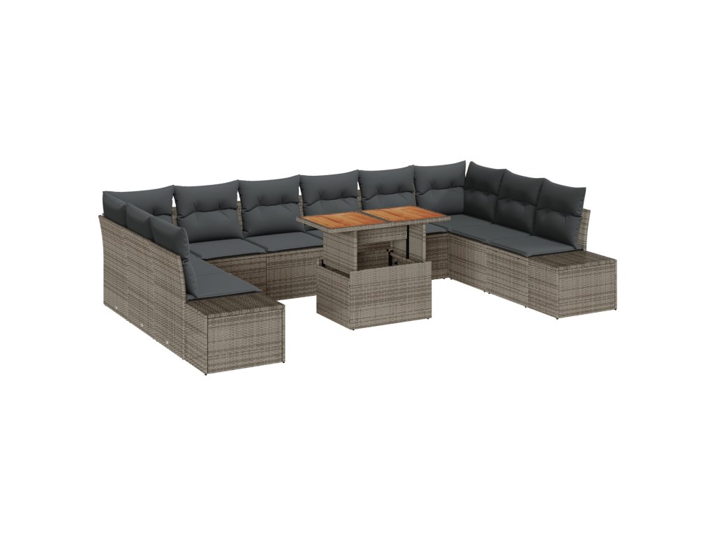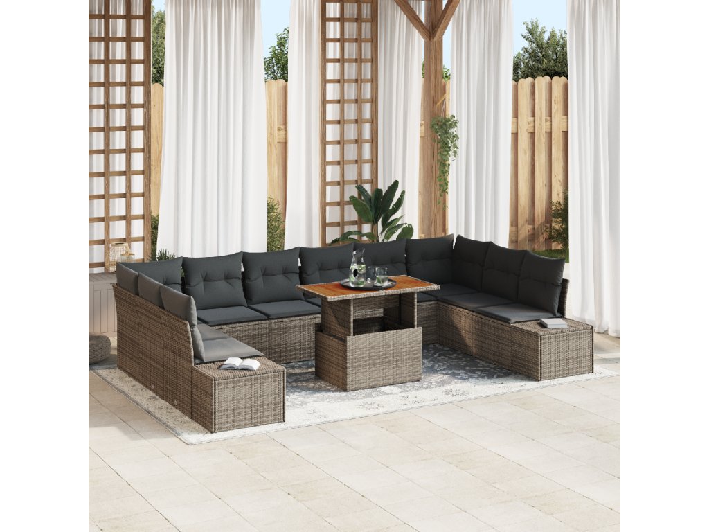 Odolné materiály: Sestaveno z kombinace poly ratanu, práškově lakované oceli a masivního akáciového dřeva, tato sada slibuje sílu, stabilitu a elegantní vzhled. Tyto materiály jsou vybrány pro své vlastnosti odolné vůči počasí, což zajišťuje dlouhověkost nábytku v různých ročních obdobích. Komplexní komponenty: Sada zahrnuje dva boční sofa, dva rohové sedáky, šest centrálních sedáků a zahradní stolek. Každý sedací modul chytrým způsobem integruje funkci úložného prostoru, což poskytuje dostatek místa pro pohodlné uskladnění zahradních doplňků. Ergonomické prvky: Užij si pohodlí polstrování s pěnovou výplní, snadno odnímatelnými sedacími poduškami se zipy a modulárními možnostmi uspořádání, které zvyšují použitelnost. Čtvercové opěrky a dobře podporované zádové opěrky zajišťují relaxaci na delší dobu. Nastavitelnost: Uprav si zážitek ze sezení podle své preference s nastavitelnými nožičkami, které nabízejí stabilitu na nerovných plochách. Ruční úpravy ti umožní snadno vyzkoušet různé konfigurace. Snadná údržba: Chraň a udržuj svou sadu s minimálním úsilím. Použij kryt na nábytek, když se nepoužívá, a vyhýbej se vystavení tvrdému počasí, aby tvoje sada zůstala v perfektním stavu po léta.- Barva: Šedá a hnědá