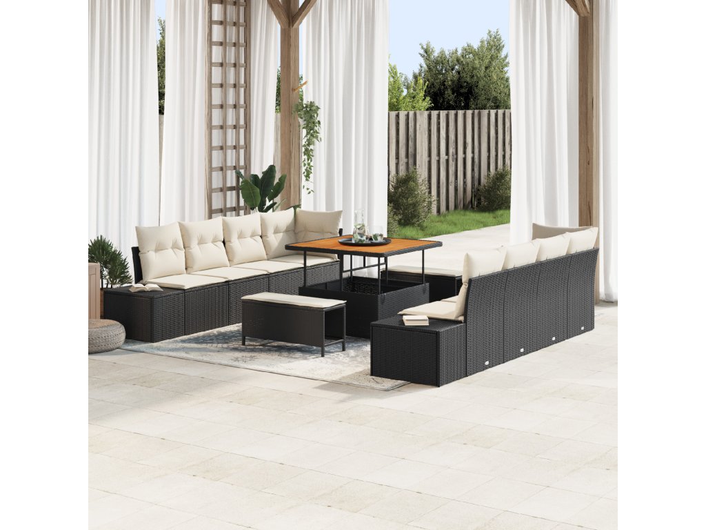 Odolný poly ratan Tento zahradní set má exteriér z poly ratanu, který dodává šmrnc a je odolný vůči UV záření, dešti a jiným přírodním vlivům. Materiál je velmi trvanlivý, takže si uchovává tvar i barvu při dlouhodobém používání. Vaše investice tak vydrží sezónu za sezónou. Ocelová konstrukce s práškovým nástřikem Navržena pro stabilitu, konstrukce zajišťuje pevnost a zároveň hezký vzhled. Vybrána pro svoje rezistivní vlastnosti vůči rzi, takže pohovka si zachová svou atraktivitu i při venkovních podmínkách. Spolehlivý základ harmonizuje s prostředím. Akcenty z masivního akáciového dřeva Pohovka je obohacena o masivní akáciové dřevo, které dodává elegantní nádech. Dřevo je silné a odolné vůči špatnému počasí, takže krásně ladí se zahradou a přináší dlouhotrvající funkčnost. Polstrované sedací polstry se zipem Odnímatelné polstry s odolnými zipy kombinují pohodlí a praktičnost. Polyesterové vlákno poskytuje potřebnou oporu, a snadno se udržují, takže sedací část zůstává hezká a pohodlná. Praktická úložná řešení Set má skryté úložné prostory v lavicích a ottomanech, takže pojme všechno od polštářů po venkovní doplňky. Tyto úložné řešení pomáhají udržovat pořádek venku a dodávají praktičnost a špetku stylu.- Barva: Černá a krémová