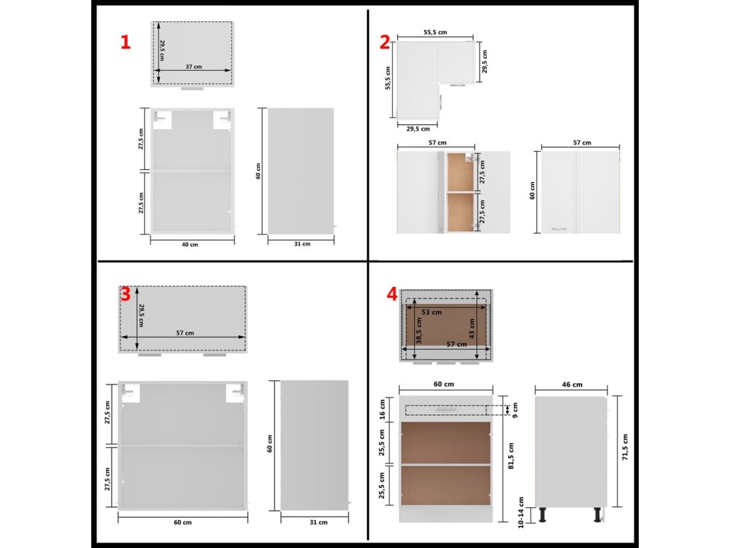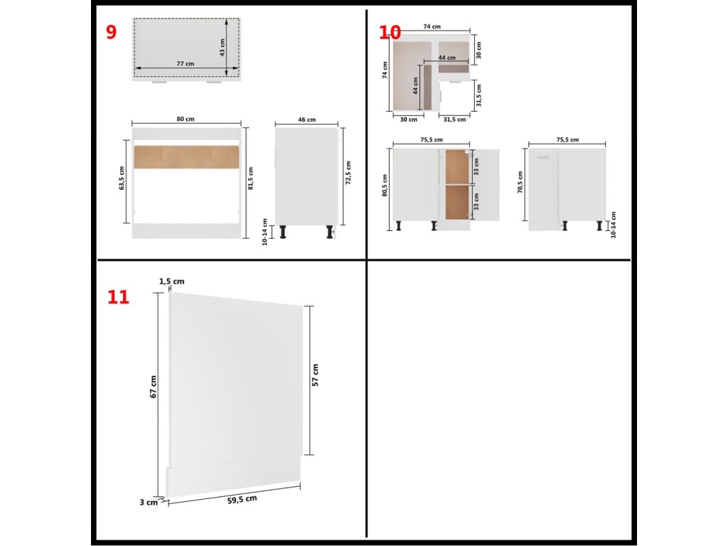 - 1 x Rohová spodní skříňka: 75,5 x 75,5 x 80,5 cm (Š x H x V)