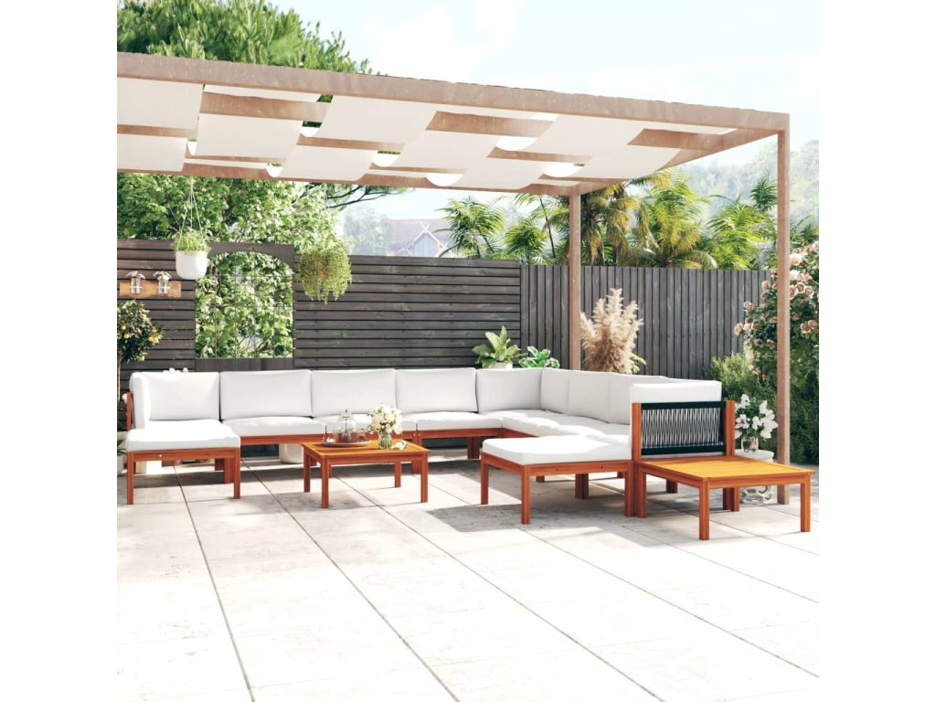 12dílná zahradní sedací souprava s polštáři krémové dřevo akácie a provaz