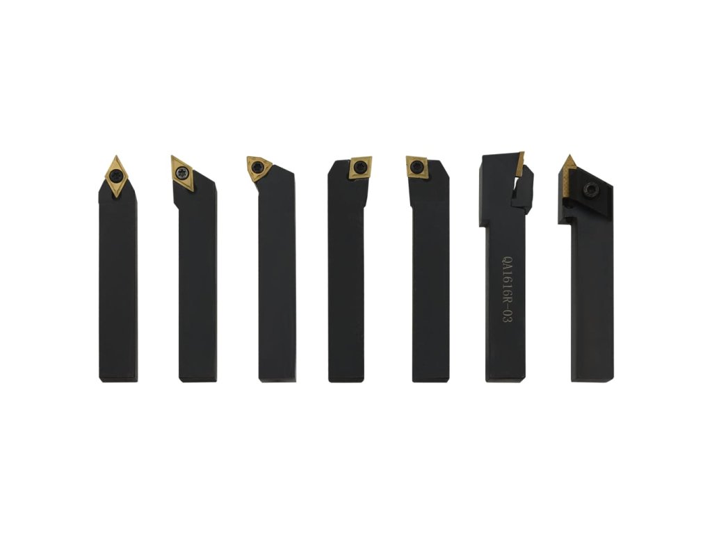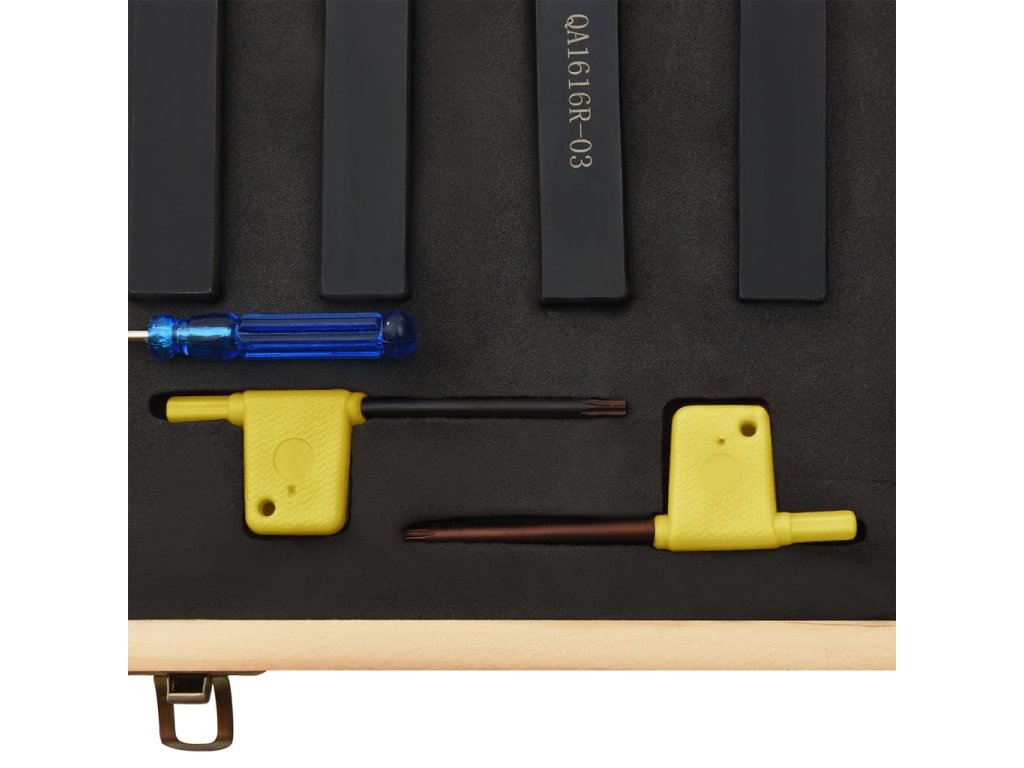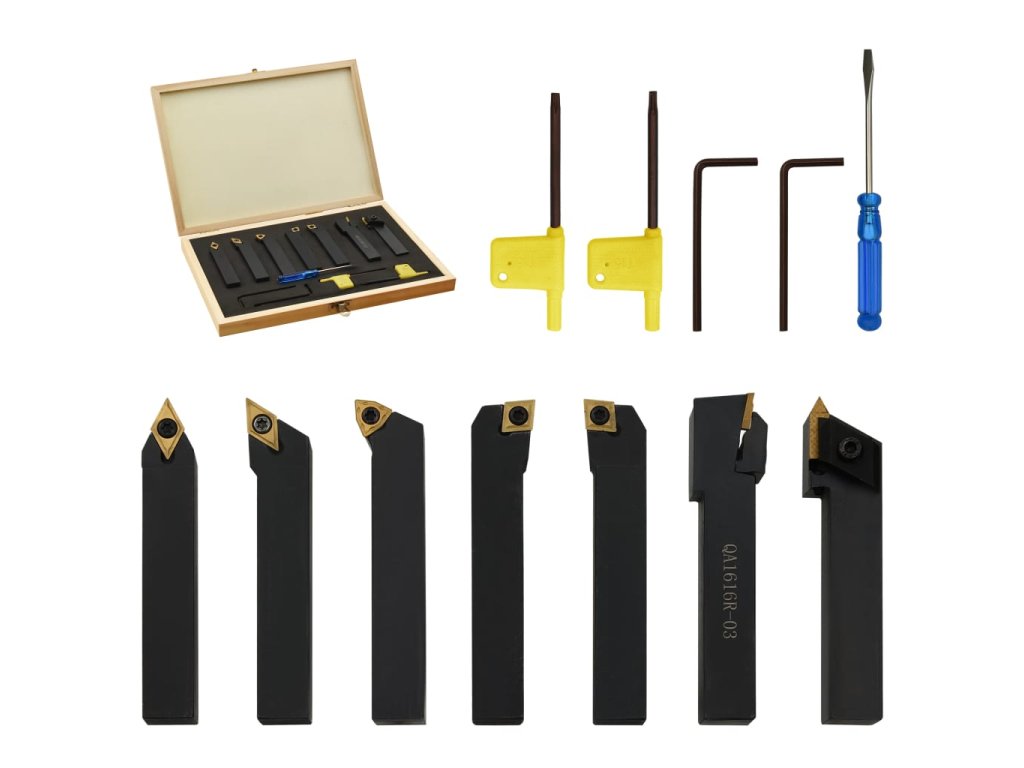 Tyto nástroje jsou vyrobené z uhlíkové oceli a slinutého karbidu a nabízejí vysokou tvrdost a dobrou houževnatost. Držáky mají černý oxidovaný hladký povrch, označený typem držáku nástroje a rozměry trhu. Vložka každého nástroje je vyměnitelná a indexovatelná. Součástí dodávky jsou také vyměnitelné klíče. Sada je dodávaná s boxem pro snadné skladování a přepravu.