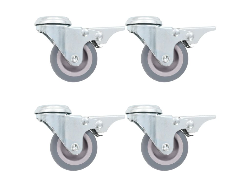 Kolečka jsou vyrobená z TPR (termoplastické gumy), která je známá pro svou schopnost pohlcovat nárazy a vibrace. Ať už tedy kolečka namontujete na cokoliv, budete to moci přesouvat hladce a v tichosti. Jejich hladký povrch navíc ochrání vaši podlahu před poškrábáním. Zinkem potažený ocelový rám je odolný proti rzi, dodává kolečkům na odolnosti a prodlužuje jejich životnost. Otočná kolečka jsou vybavená brzdou pro flexibilnější ovládání. Každé kolečko má maximální nosnost až 35 kg.