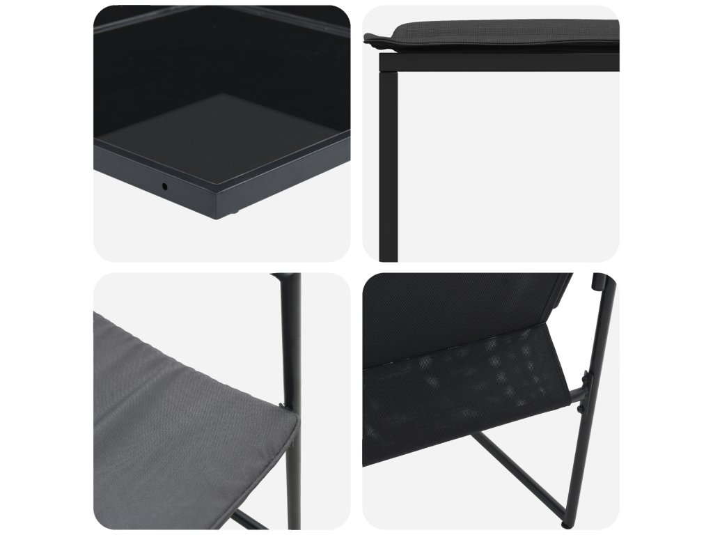 Odolné materiály: Pevná ocel dělá tento set stabilním a spolehlivým na dlouhou dobu, odolává rzi a poškození pro skvělý venkovní zážitek. Praktický design: Moderní vzhled se hodí do každého venkovního interiéru a přidává eleganci tvé zahradě nebo terase. Snadná montáž: Sestavení není žádná věda, takže ti ušetří čas a nervy. Odolnost vůči počasí: Tento jídelní set je navržený na každé počasí, takže si zachovává svůj šarm i sílu i v drsných podmínkách díky voděodolným textilovým materiálům. Univerzální použití: Perfektní pro zahradní párty, terasy nebo balkony – tenhle set se hravě začlení do jakéhokoliv venkovního prostředí a zajistí pohodlný zážitek při jídle pro každého.- Barva: Černá