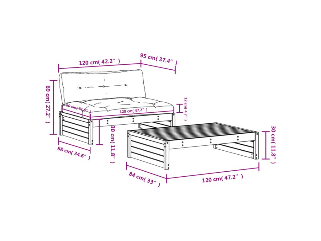 - Rozměry středové pohovky: 120 x 95 x 69 cm (D x Š x V)