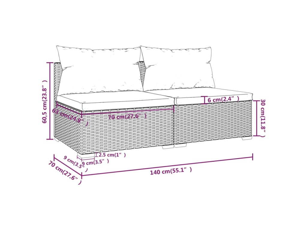- Rozměry středové pohovky (každé): 70 x 70 x 60,5 cm (D x Š x V)