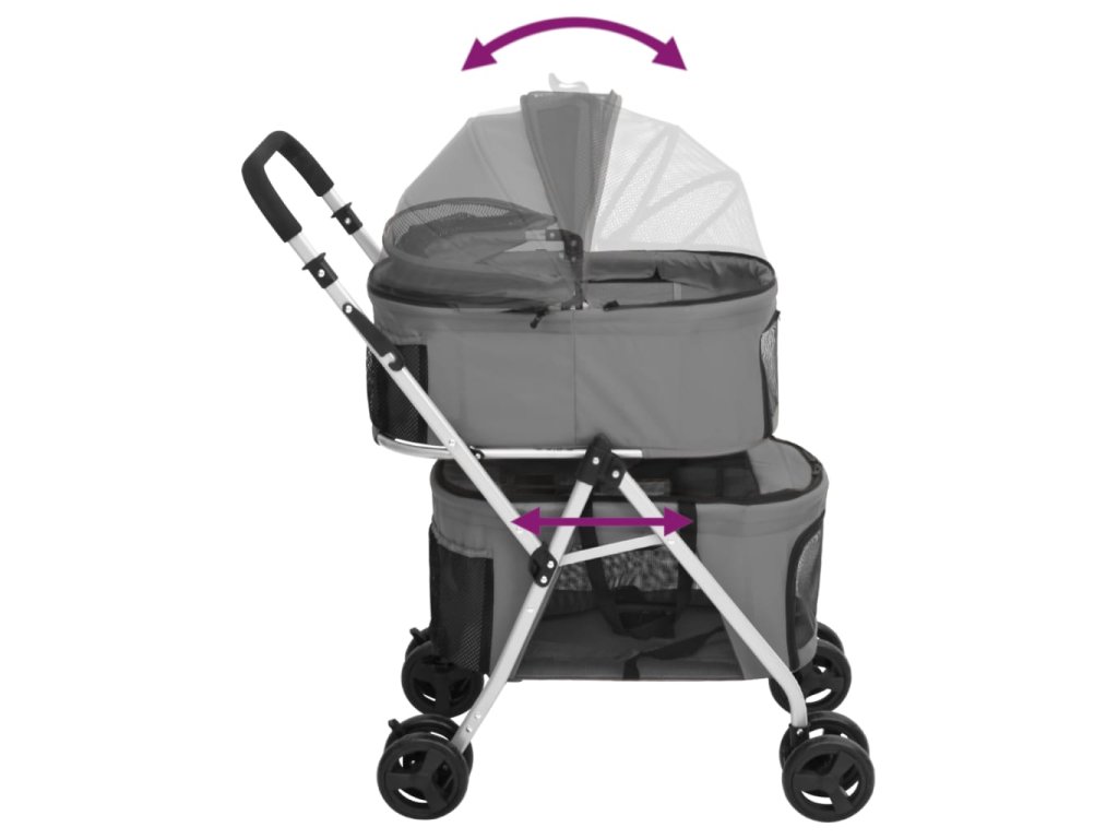- Pohodlné a bezpečné sezení: Stříška chrání vašeho domácího mazlíčka před intenzivním slunečním zářením a zvyšuje jeho pohodlí. Podle potřeby se dá složit dozadu nebo sklopit dopředu. Použijte vodítko uvnitř sedačky, abyste zvýšili bezpečnost vašeho štěněte při sezení v kočárku.