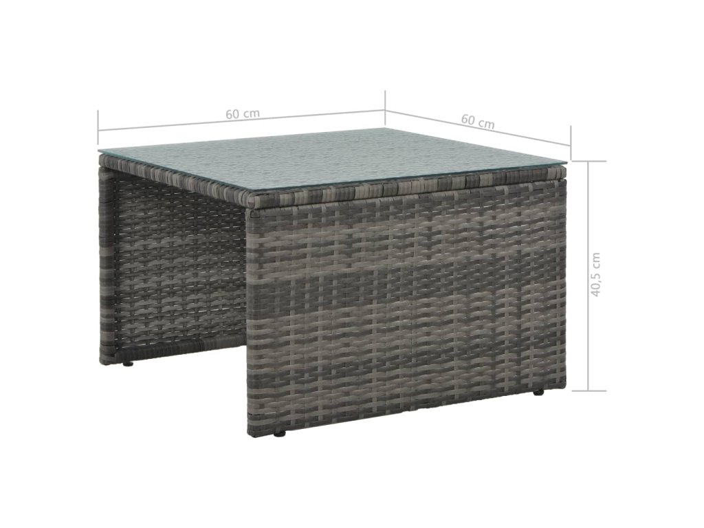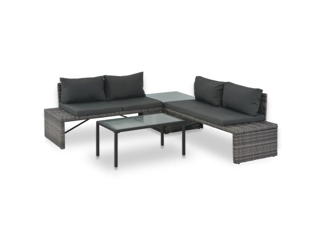 Tato polyratanová sedací souprava sestává z 1 konferenčního stolku, 1 rohového stolku, 2 pohovek, 4 polštářů a 4 podušek na sedáky. Pomůže vám vytvořit stylové posezení na vaší zahradě či terase.