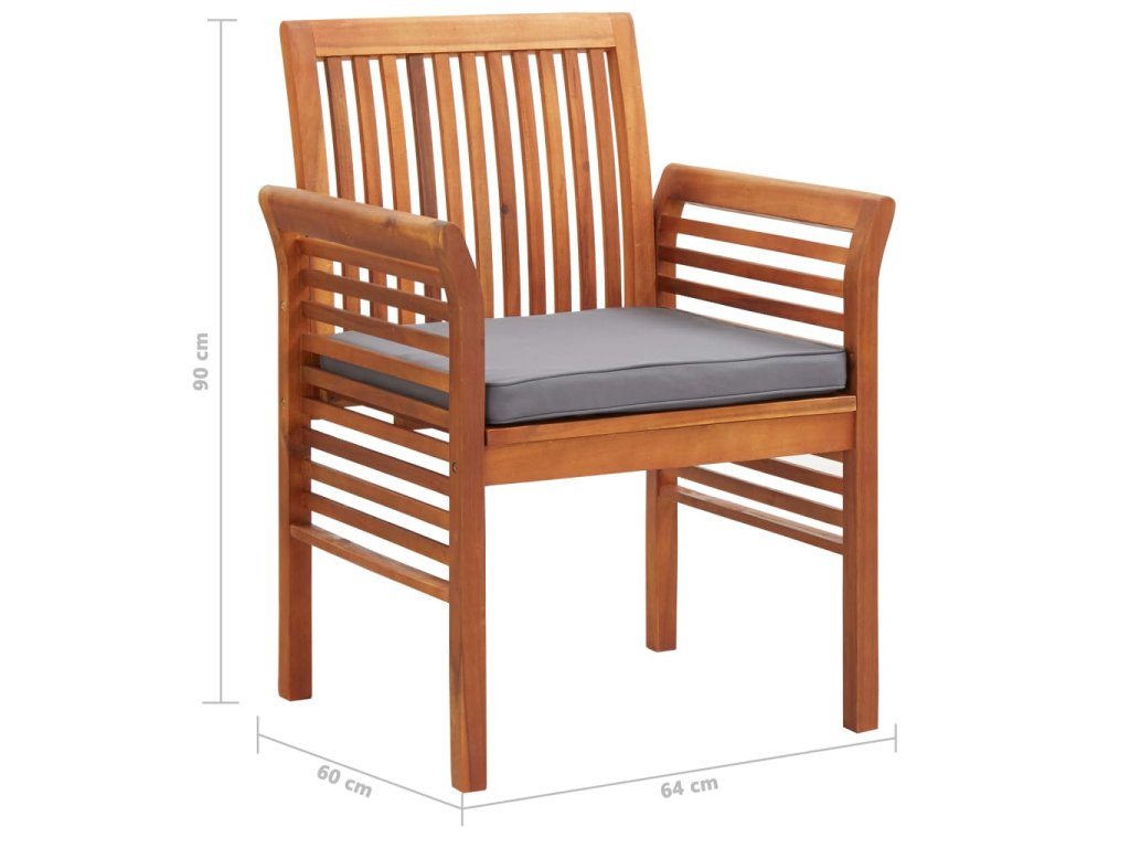 Stůl a židle s laťkovým designem jsou vyrobené z masivního akáciového dřeva s olejovou povrchovou úpravou, které je klimaticky odolné a vhodné pro venkovní použití. Olejem napuštěný povrch se také snadno čistí. Měkké podušky na sedácích vám při odpočinku na čerstvém vzduchu zaručí pohodlí. Když set nepoužíváte, můžete ho zakrýt nebo uložit, abyste prodloužili jeho životnost.
