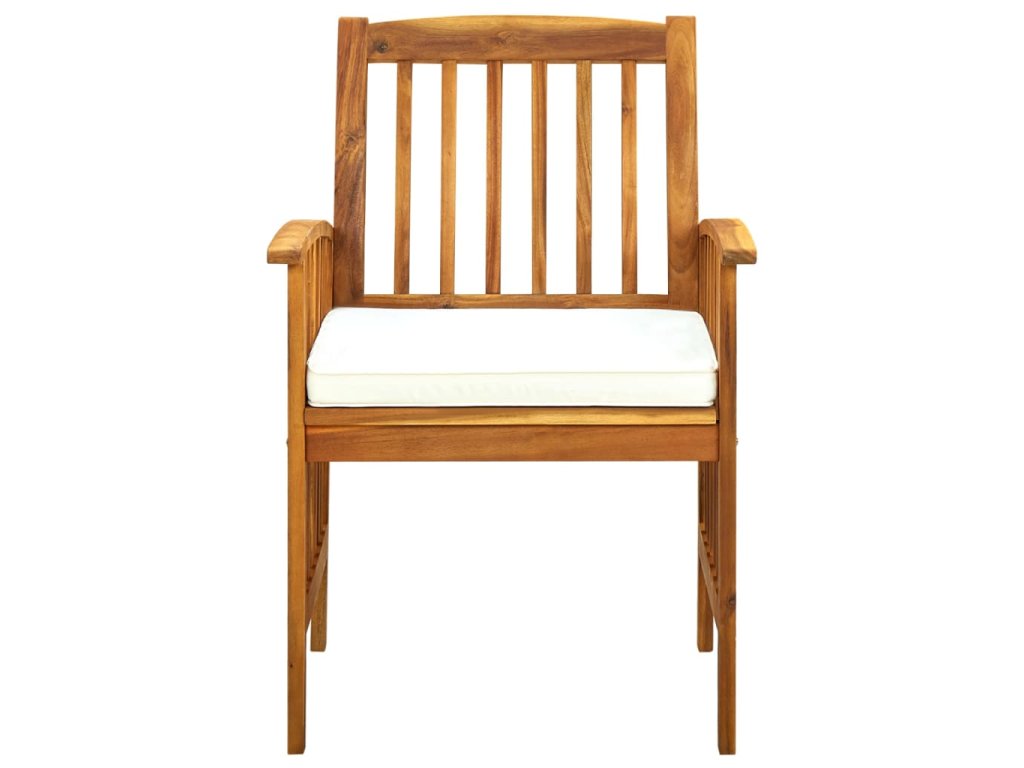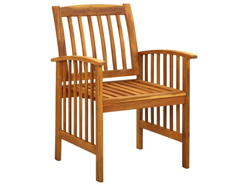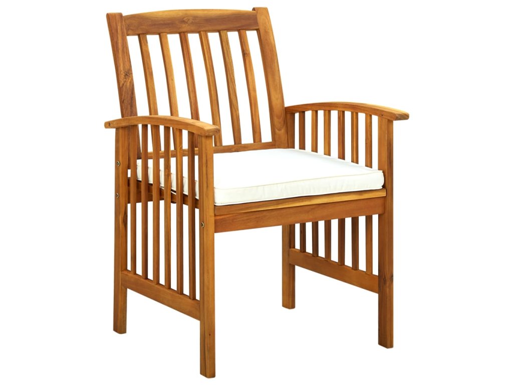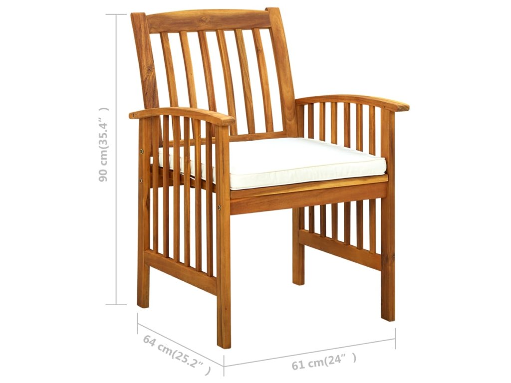Jídelní stůl je vyrobený z masivního akáciového dřeva, tvrdého dřeva s hustou strukturou, takže je robustní, odolný a snadno se udržuje. Na dřevěnou stolní desku můžete prostřít k jídlu, servírovat nápoje a odkládat si celou řadu věcí. Dřevěné rámy židlí jsou ošetřené olejem a na vaši terasu nebo dvorek vnesou klasický vzhled a vaše venkovní bydlení oživí svým přírodním šarmem. Hustě polstrované podušky vám poskytnou dodatečné pohodlí při sezení a relaxaci. Tuto sestavu zahradního nábytku můžete snadno očistit vlhkým hadříkem.