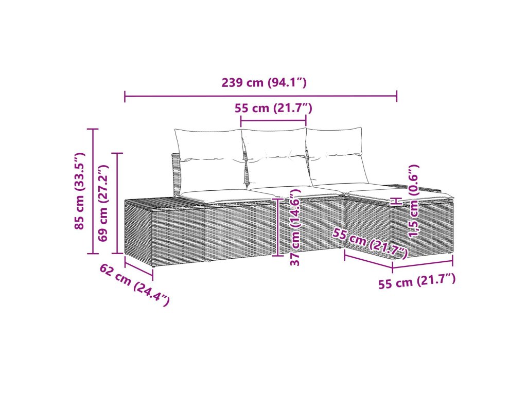 - 1 x střední sedadlo: 55 x 62 x 69 cm (D x Š x V)