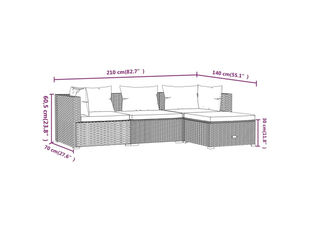 - Rozměry rohové/středové pohovky (každé): 70 x 70 x 60,5 cm (D x Š x V)