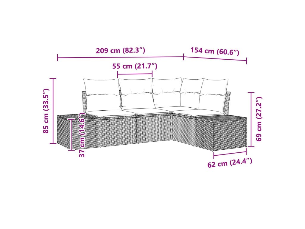 - 1 x Rohové sedadlo: 62 x 62 x 69 cm (D x Š x V)