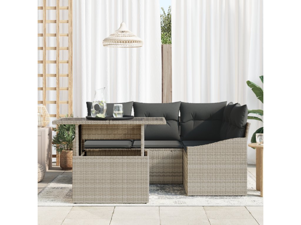 Materiály: Hlavní materiál je poly ratan, který je trvanlivý a odolný vůči počasí. Ratanový výplet má pěknou texturu, která se hodí do každé zahrady. Součásti: V setu najdete rohové sedátko, středové sedátko, dvě pohovky s opěrkami a stůl, všechny navržené pro pohodlné venkovní relaxování. Sedadla mají tenké podložky pro příjemné sezení. Vlastnosti / funkce / design: Tento set je modulární, takže ho můžete přestavět podle toho, jak potřebujete. Je lehký, takže s ním snadno hnete a přizpůsobíte ho každé příležitosti. Doporučené použití: Ideální na jarní a letní setkání, skvěle se hodí na zahrady a terasy, kde poskytne elegantní prostředí pro sezení. Moderní design zajistí, že zkrášlí jakékoli místo. Péče a údržba: Aby set vydržel co nejdéle, doporučuje se používat kryt, když ho právě nepoužíváte. Tímto jednoduchým krokem udržíte pohovku v perfektní kondici a prodloužíte její životnost.- Barva: Světle šedá