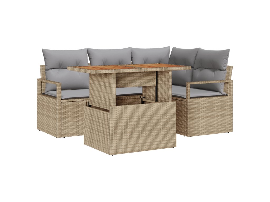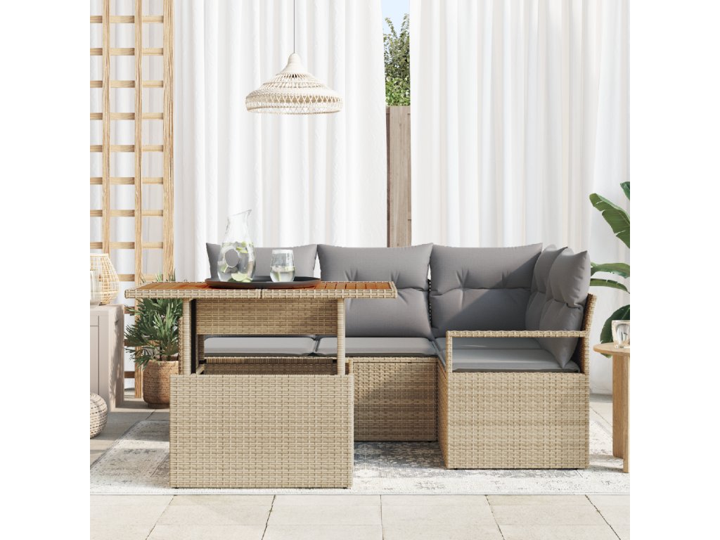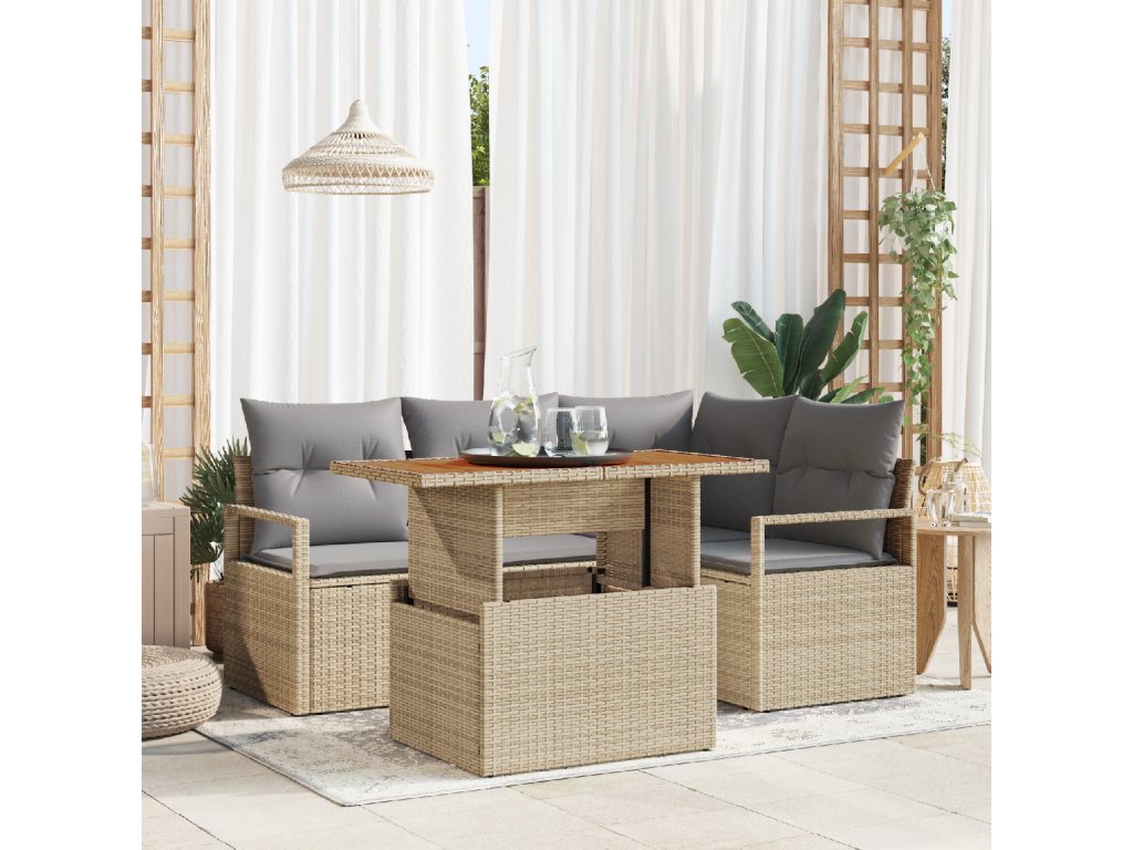Použité materiály: Souprava je vyrobena z vysoce kvalitního poly ratanu, známého svojí odolností a vlastnostmi odolnými vůči povětrnostním vlivům. Masivní akáciová dřevěná deska přidává rustikální kouzlo, které doplňuje robustní rám z práškově lakované oceli, zajišťující odolnost vůči venkovním prvkům. Sezení: Každá sedací jednotka disponuje měkkými polyesterovými polštáři plněnými lehkou pěnou, s bezpečným zipem pro snadné sejmutí a čištění. Čtvercové opěrky rukou poskytují podporu a styl, zvyšující komfort během delšího používání. Flexibilita série: V souladu se svým modulárním charakterem může být tato jídelní souprava nakonfigurována tak, aby vyhovovala individuálním preferencím v různých zahradních uspořádáních. Její funkční design zahrnuje nastavitelnou výšku nohou, zajišťující stabilitu na nerovném povrchu, což je důležitá funkce pro venkovní nábytek. Ochrana a údržba: Aby si zachovala svůj vzhled a funkčnost, doporučuje se vodotěsný kryt, když není v používání. Použití suchých metod při čištění zajistí její dlouhověkost a vizuální přitažlivost. Souprava je navržena tak, aby odolávala nástrahám počasí, nabízející roky spolehlivého servisu. Univerzální použití: Ideální pro pořádání brunchů s přáteli nebo užívání si klidných odpolední osamoceně v zahradě. Jídelní souprava se bez problémů přizpůsobuje různým příležitostem, poskytující jak praktičnost, tak přívětivou atmosféru.- Barva: Beige a šedá