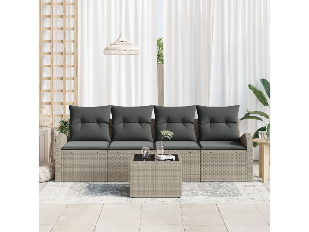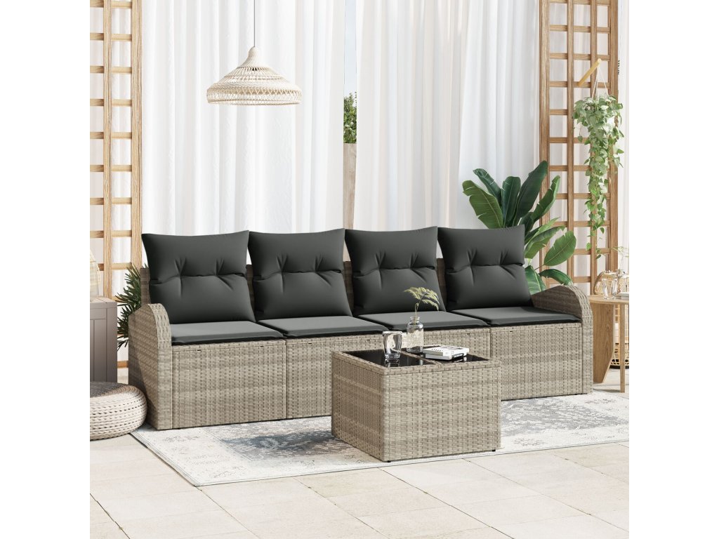 Odolné materiály Tento pohovkový set je vyrobený z kvalitního poly ratanu, který je odolný vůči povětrnostním vlivům, takže zůstane v pohodě za různých podmínek – ideální pro celoroční užití na terase nebo zahradě. Obsah setu S masivním ocelovým rámem a poly ratanovým zadem, set přichází s pohodlnými polstry s odnímatelnými a pratelnými potahy, což znamená snadnou údržbu a dlouhé pohodlí. Temperované skleněné stolky jsou silné a lehce se čistí. Jedinečné vlastnosti Tento pohovkový set vyniká lehkým designem, což usnadňuje přeuspořádání vaší terasy. UV ochrana zajišťuje, že si dlouho uchová svůj vzhled. Modulární struktura dává uživatelům možnost přizpůsobit jeho uspořádání podle potřeby. Univerzální použití Navržený pro léto, tento set se skvěle hodí na terasy a do zahrad, vytváří příjemnou atmosféru pro relaxaci a setkání. Jeho moderní styl ladí s různými prostředími, takže se hodí do rezidenčních i komerčních prostorů. Údržba Pro zachování vzhledu stačí po použití otřít vlhkým hadříkem a v dešti ho zakrýt, abyste prodloužili jeho životnost a estetiku.- Barva: Světle šedá
