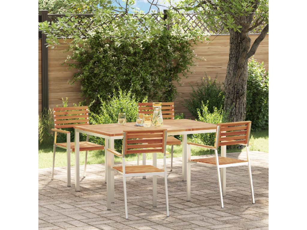 Pevný rám z nerezové oceli - Set je vyrobený pro odolnost, rám z nerezové oceli zajišťuje pevnost proti počasí. Moderní design dodává styl vaší zahradě. Pohodlné opěrky a opěradlo - S plochými opěrkami a dobře navrženým opěrákem, což je ideální mix elegance a komfortu. Hladké opěrky jsou příjemný detail a umělecké opěradlo dodává kouzlo. Pevný lamelový rošt - Set má robustní lamelový rošt pro venkovní použití. Umožňuje vzduchu procházet a rychle schne, zatímco lamely jsou dost odolné na běžné opotřebení. Matný, odolný povrch - Matný povrch vypadá super a není přehnaný. Povrchy jsou odolné vůči skvrnám, takže údržba je snadná a nábytek zůstává v dobrém stavu. Snadné pokyny k údržbě - Udržujte nábytek v super stavu použitím voděodolného krytu, když ho skladujete. Pravidelně ho čistěte šetrně a ukládejte na suchém místě, abyste si ho užili déle.- Barva: Hnědá