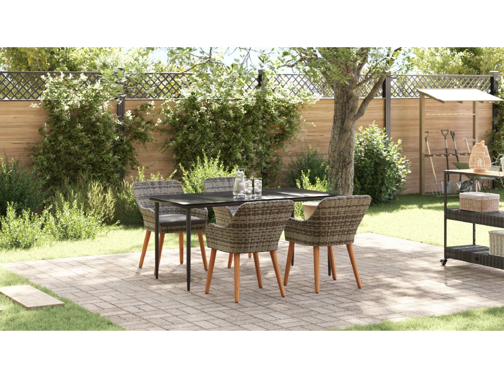 Odolné materiály: Díky kvalitnímu poly ratan a silný oceli, tato sada vydrží všechno, suitable for co počasí přinese po celý rok. Je navržená tak, aby odolávala dešti, UV paprskům a opotřebení, takže ji můžeš bez obav používat na venkovní akce. Můžeš se na ní spolehnout, že bude stabilní a bude vypadat skvěle i po mnoha posezení. UV-odolná kvalita: Tato sada má UV-odolné materiály, které ji udržují stále pěknou a silnou, brání vyblednutí na slunci. Takže vždycky bude vypadat skvěle a váš venkovní prostor zůstane čerstvej bez ohledu na roční období. Elegantní design stolu: Mrkni na skvělej patio stůl s elegantním skleněným povrchem. Snadno se čistí a vypadá skvěle, spojuje styl s praktičností, takže venkovní stolování je radost. Pohodlné sezení: Tato jídelní sada obsahuje příjemný polštáře na sezení, které mají praktické zipy, což dělá dlouhá jídla venku bezproblémový. Poly ratanový židle ne jenom dobře vypadají, ale taky jsou pohodlný, ideální na lenošení v letních dnech. Údržba a péče: Aby vaše sada zůstala v top stavu, používejte kryty, když není v provozu. To ji chrání před nepříznivým počasím a pomáhá jí dlouho vydržet. Navíc je snadná na údržbu, takže se můžeš soustředit na užívání si prostoru vaší zahrady.- Barva: Šedá