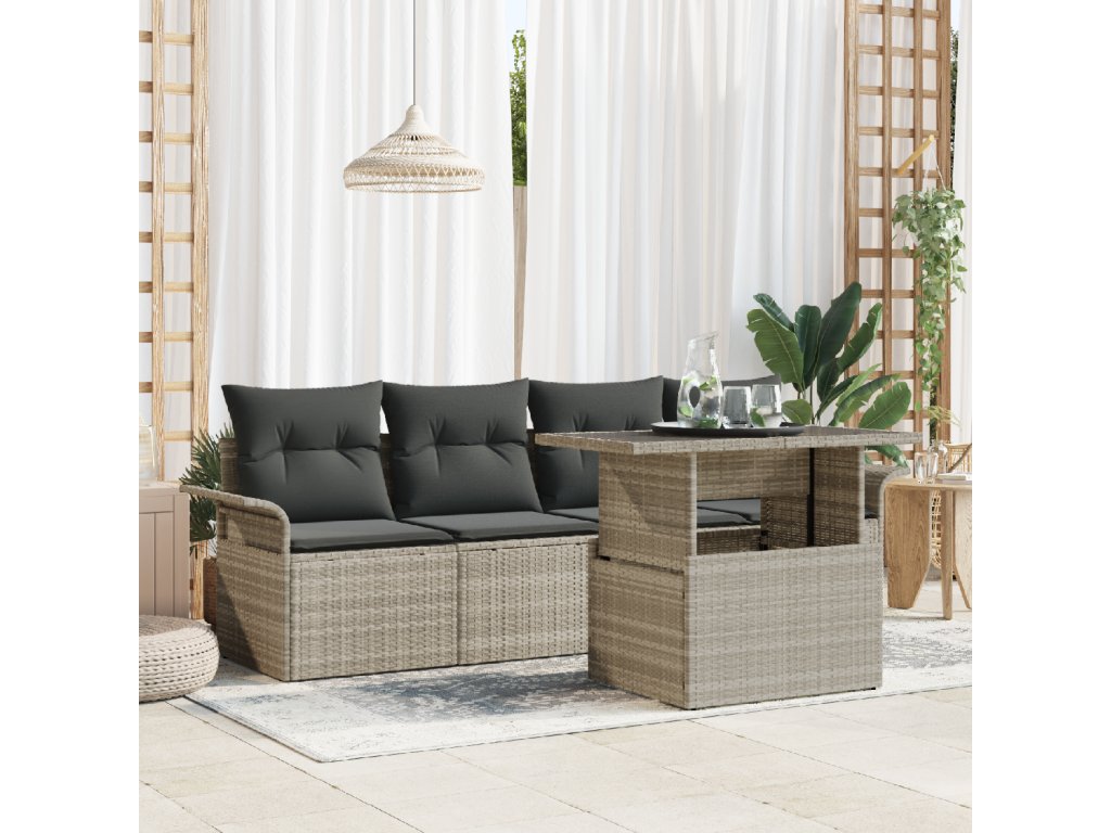 Elegance poly ratanu: Tahle souprava je udělaná z kvalitního poly ratanu, což jí dává stylový vzhled a trvanlivou konstrukci. Poly ratan je známý svou odolností, takže tvůj nábytek vypadá skvěle i za různých podmínek. Pohodlné polštáře zahrnuty: Set zahrnuje venkovní polštáře z odolného polyesteru, které jsou navržené pro komfort a styl. Tyhle měkké polštáře ti poskytnou podporu a pořád si udrží svůj lstivý vzhled i po vystavení venkovním podmínkám. Rám z práškované oceli: Ocelový rám má práškovou úpravu, která mu dává skvělý povrch a chrání ho před venkovními vlivy. Tato úprava nejen že chrání rám, ale poskytuje mu i elegantní vzhled, který se hodí do moderních prostor. Povrch z tvrzeného skla: Stůl s tvrzeným sklem přidává funkční a decentní lesk k celému setu. Je to luxusní prvek a zároveň snadno se udržuje a čistí. Jednoduchá údržba: Aby sis zachoval dobrý vzhled, doporučujeme schovávat polštáře dovnitř při špatném počasí a používat kryt, když nesedíš. Tím usnadňuješ údržbu a zajišťuješ, že si zásadu užíváš dlouho.- Barva: Světle šedá