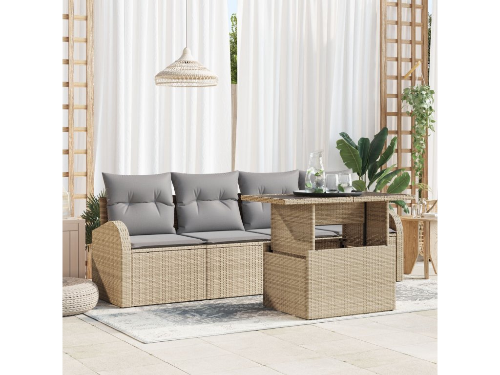 Odolné materiály: Zahradní pohovka je vyrobená z kvalitního poly ratanového vlákna a práškově lakované oceli, což zaručuje spolehlivost a odolnost proti blednutí. Silná konstrukce zajišťuje dlouhou životnost, takže se stává oblíbenou volbou pro venkovní relaxaci po celý rok. Univerzální komponenty: Tato souprava obsahuje dvě centrální sedačky, dvě arm sofa a stůl, což umožňuje přizpůsobení vašim prostorovým potřebám. Flexibilita usnadňuje různá uspořádání, ať už pořádáte večírek nebo relaxujete o samotě. Funkční design: Výškově nastavitelný stůl snadno přechází od neformálních kávových chvil k elegantnímu stolování. Díky lehké, modulární konstrukci je přemisťování hračka. Ekologické vlastnosti: Odolnost proti UV záření a povětrnostním vlivům zajišťuje trvalou pohodu bez ohledu na klimatické podmínky. Pokyny pro péči: Používejte kryt, když je souprava v nečinnosti, abyste uchovali její vzhled. Tímto snadno udržujete pohovku v parádním stavu.- Barva: Béžová