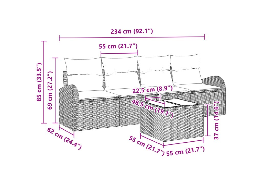 Modulární zahradní pohovka spojuje moderní design s funkční elegancí a je ideální pro zlepšení vašeho venkovního prostoru. S obdélníkovým stylem, tenhle set dodá skvělý vzhled, který si užijete při večerních srazech nebo odpoledním slunění. Navrženo pro ty, co si cení stylu a flexibility, lze rozložení upravit podle různých potřeb - od útulných míst po společenské uspořádání.