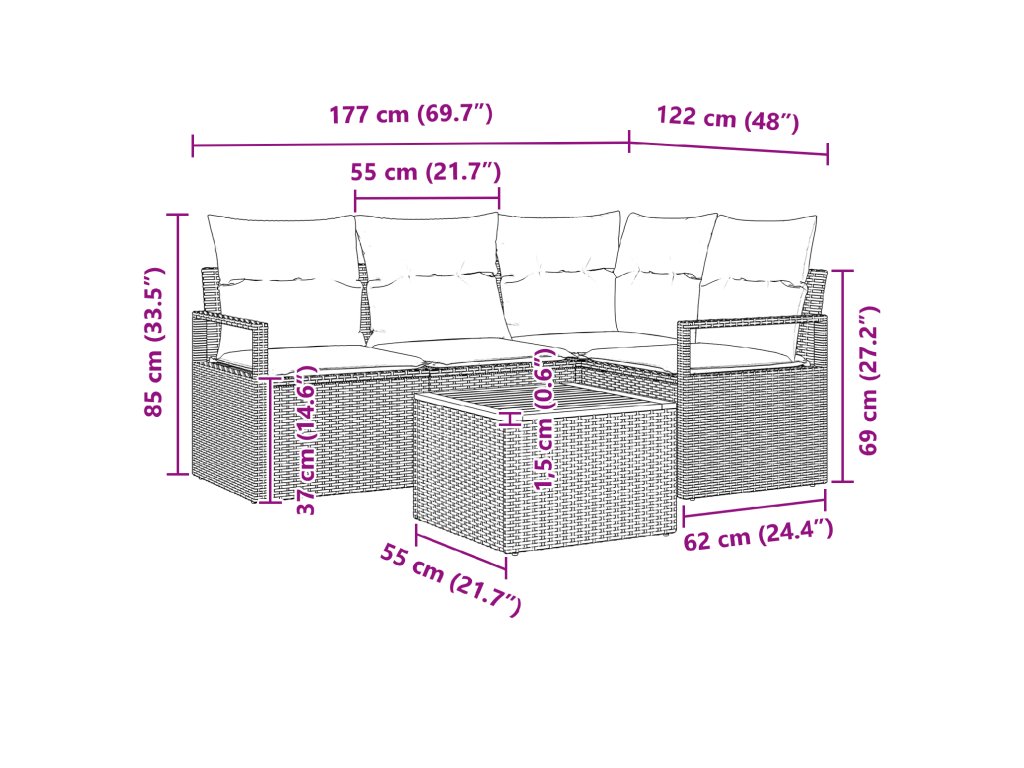 Tento zahradní sofa set je perfektním spojením stylu a funkčnosti, navržený tak, aby proměnil váš venkovní prostor na sofistikované útočiště na relaxaci. Jeho moderní estetika, charakterizovaná čistými liniemi a tkanou texturou, obohacuje jakoukoli zahradu nebo terasu. Pevná konstrukce zajišťuje, že vyhovuje jak intimním shromážděním, tak i pompézním party.
