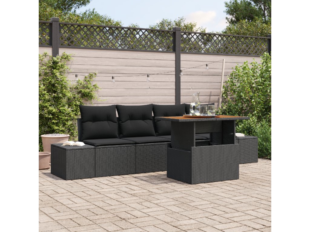 Prémiové materiály: Tato jídelní sada je vyrobena z vysoce kvalitního poly ratanu, známého pro svůj moderní styl a odolnost. Rám z práškově lakované oceli a masivního dřeva akácie poskytuje robustní strukturu, která zajišťuje stabilitu proti vnějším silám a povětrnostním podmínkám, zatímco kombinované materiály nabízejí skutečný přírodní vzhled. Obsahované komponenty: Sada zahrnuje dvě boční pohovky a dvě centrální sedadla, z nichž každé má praktickou úložnou funkci. Tento promyšlený design zvyšuje funkčnost a umožňuje snadné uložení venkovních potřeb a udržení prostoru v pořádku, ideální pro moderní venkovní život. Funkce a design: Využijte bezkonkurenční flexibilitu s nastavitelnosti nožičkami a modulárním designem, který vám umožňuje změnit uspořádání sady podle vašich požadavků. Elegantní, stylové čtvercové opěrky a hotové zádové části dodávají moderní nádech, splňující jak estetické, tak komfortní potřeby. Doporučené využití: Ideální pro zahradní a terasové prostory, ideální na letní a jarní večery. Tato sada poskytuje luxusní sezení pro neformální setkání, stolování nebo příjemné lenošení, přizpůsobující se atmosféře vašeho osobního venkovního ráje. Údržbová strategie: Pro trvalou krásu dodržujte jednoduché pokyny pro péči – zakryjte, když se nepoužívá, aby se chránilo před prvky. Sedadla lze rozepnout pro snadné čištění. Tato minimální údržba zajišťuje, že vaše jídelní sada zůstává po celou dobu používání v dokonalém stavu.- Barva: Černá a hnědá