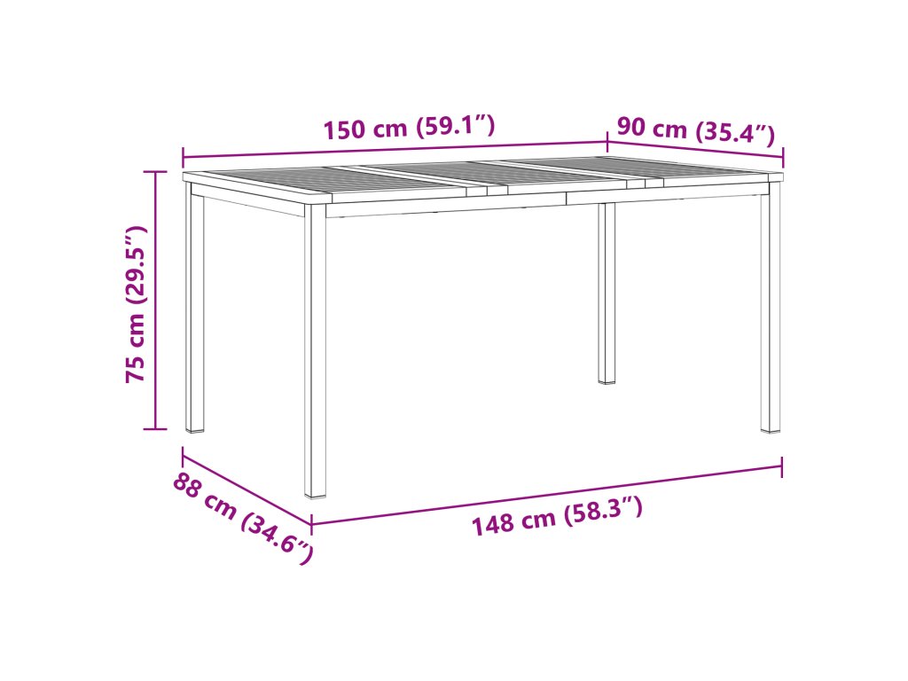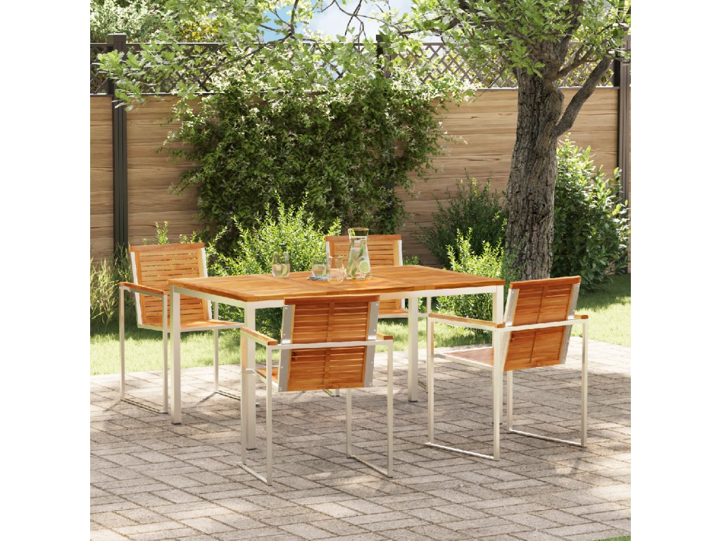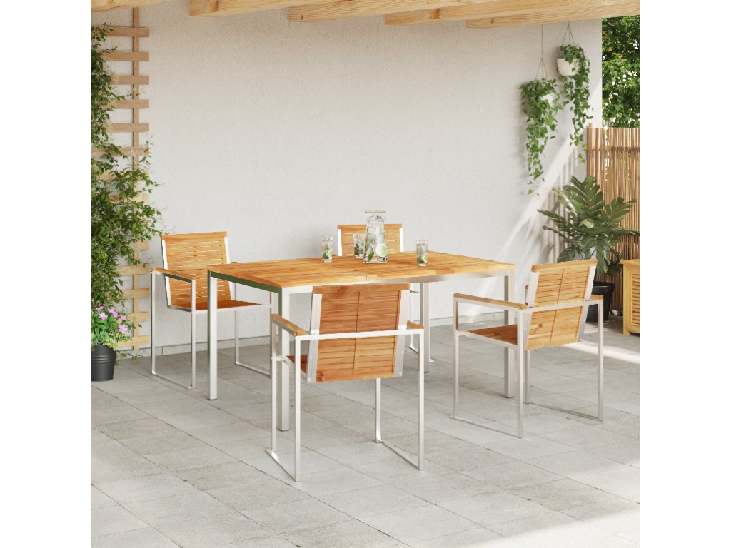 Pevný rám: Silný ocelový rám zajišťuje stabilitu, abyste si mohli v klidu vychutnávat jídlo. Je odolný vůči venkovním podmínkám, což ho činí skvělou volbou pro časté venkovní posezení. Elegantní dřevěný povrch: Dřevěná deska stolu dodává přírodní vzhled a skvěle ladí s ocelovým rámem. Je navržena tak, aby měla dobrý odtok, což usnadňuje údržbu a skvěle vypadá na vašem venkovním prostoru. Odolný design: Tento set je vytvářen pro venkovní použití, zvládne jakékoli počasí. Můžete mít klid, že bude silný a vypadat skvěle, ať prší, nebo svítí slunce, díky svému chytrému designu. Moderní funkční styl: Svým moderním vzhledem a jednoduchými detaily se tento set snadno hodí do současných venkovních prostor, kombinuje funkčnost a styl bez námahy. Jednoduché pokyny pro údržbu: Aby byl v perfektním stavu, zakryjte ho, když ho nepoužíváte, a otřete vlhkým hadříkem. Tyto jednoduché tipy na údržbu zajistí, že váš jídelní set zůstane v dobrém stavu dlouho!- Materiál: Masivní teakové dřevo