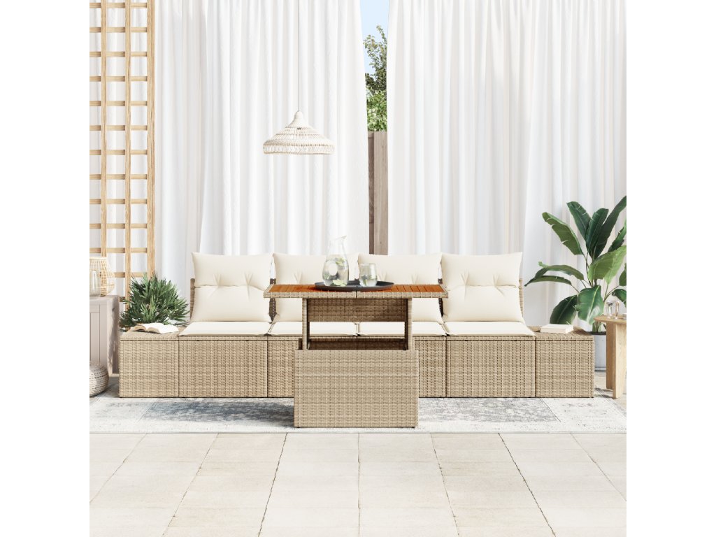 Prémiové materiály: Tato jídelní sada je vyrobena z vysoce kvalitního poly ratanu, známého pro svůj moderní styl a odolnost. Rám z práškově lakované oceli a masivního dřeva akácie poskytuje robustní strukturu, která zajišťuje stabilitu proti vnějším silám a povětrnostním podmínkám, zatímco kombinované materiály nabízejí skutečný přírodní vzhled. Obsahované komponenty: Sada zahrnuje dvě boční pohovky a dvě centrální sedadla, z nichž každé má praktickou úložnou funkci. Tento promyšlený design zvyšuje funkčnost a umožňuje snadné uložení venkovních potřeb a udržení prostoru v pořádku, ideální pro moderní venkovní život. Funkce a design: Využijte bezkonkurenční flexibilitu s nastavitelnosti nožičkami a modulárním designem, který vám umožňuje změnit uspořádání sady podle vašich požadavků. Elegantní, stylové čtvercové opěrky a hotové zádové části dodávají moderní nádech, splňující jak estetické, tak komfortní potřeby. Doporučené využití: Ideální pro zahradní a terasové prostory, ideální na letní a jarní večery. Tato sada poskytuje luxusní sezení pro neformální setkání, stolování nebo příjemné lenošení, přizpůsobující se atmosféře vašeho osobního venkovního ráje. Údržbová strategie: Pro trvalou krásu dodržujte jednoduché pokyny pro péči – zakryjte, když se nepoužívá, aby se chránilo před prvky. Sedadla lze rozepnout pro snadné čištění. Tato minimální údržba zajišťuje, že vaše jídelní sada zůstává po celou dobu používání v dokonalém stavu.- Barva: Béžová a krémová