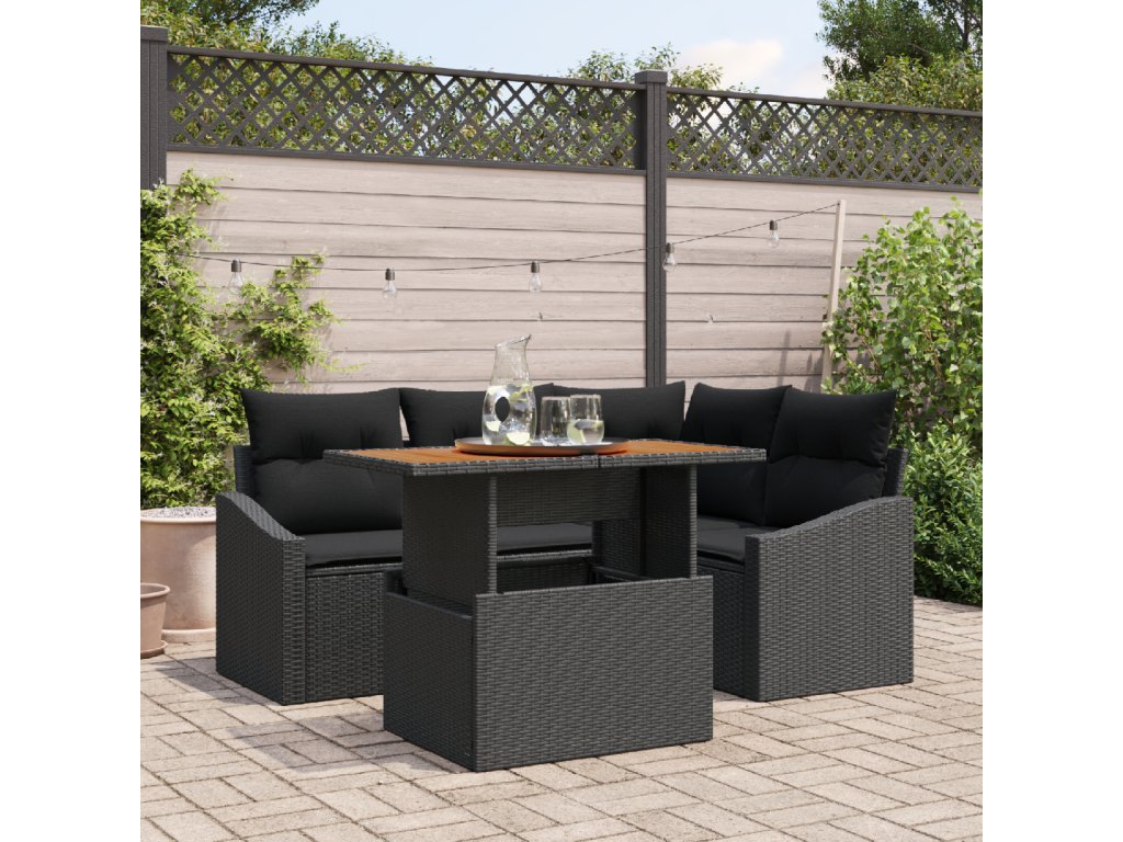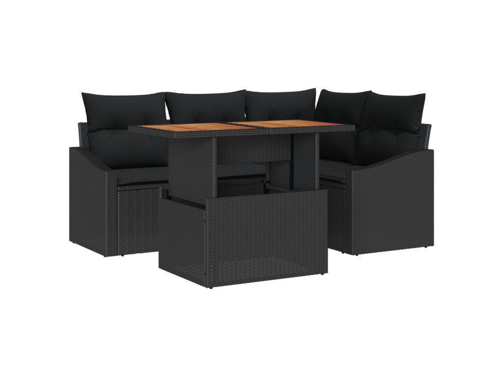 Odolné materiály: Poly ratan a práškově lakované ocelové komponenty zajišťují, že je set odolný vůči různým povětrnostním podmínkám, nabízí UV ochranu a trvanlivost pro dlouhodobé venkovní použití. Stabilní akáciové dřevěné povrchy dodávají přírodní krásu a robustní podporu, udržují atraktivní a odolnou přítomnost na vaší terase nebo zahradě. Součásti sedadel: Tento set zahrnuje dvě arm pohovky a jeden rohový a středový sedák, všechny s integrovaným úložným prostorem. Dokončený a přitažlivý zadní strana umožňuje univerzální umístění, zatímco měkké polyesterové polštáře zabezpečené zipy zaručují pohodlí a snadnou údržbu. Modulární funkce: Přizpůsobte si uspořádání sedadel snadno pomocí modulárních a nastavitelných komponentů setu, které jsou ideální pro přizpůsobení osebným potřebám. S nastavitelnými nožičkami zajistěte stabilitu na nerovných venkovních terénech, čímž zvýšíte jak funkčnost, tak pohodlí pro různá uspořádání sedadel. Doporučené použití: Tento zahradní jídelní set je navržen pro venkovní použití, což z něj činí stylový doplněk pro terasy, zahrady nebo zahrady. Jeho sofistikovaný design a praktické funkce poskytují flexibilitu pro různé příležitosti, od intimních alfresco večeří po živé letní večírky. Komplexní péče: Chcete-li zachovat krásu a dlouhověkost vašeho nábytku, ukládejte polštáře do interiéru během nepříznivého počasí a chraňte set voděodolným krytem, když se nepoužívá. Tyto jednoduché údržbové kroky zvyšují trvanlivost a vzhled pro dlouhodobé potěšení.- Barva: Černá a hnědá