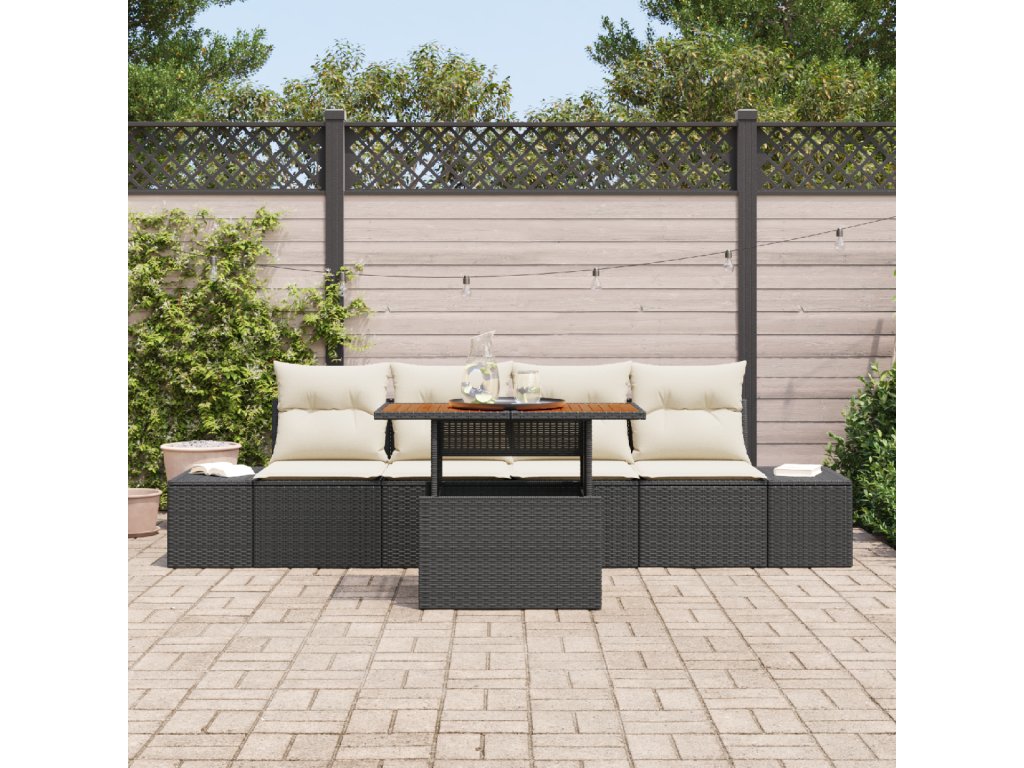 Prémiové materiály: Tato jídelní sada je vyrobena z vysoce kvalitního poly ratanu, známého pro svůj moderní styl a odolnost. Rám z práškově lakované oceli a masivního dřeva akácie poskytuje robustní strukturu, která zajišťuje stabilitu proti vnějším silám a povětrnostním podmínkám, zatímco kombinované materiály nabízejí skutečný přírodní vzhled. Obsahované komponenty: Sada zahrnuje dvě boční pohovky a dvě centrální sedadla, z nichž každé má praktickou úložnou funkci. Tento promyšlený design zvyšuje funkčnost a umožňuje snadné uložení venkovních potřeb a udržení prostoru v pořádku, ideální pro moderní venkovní život. Funkce a design: Využijte bezkonkurenční flexibilitu s nastavitelnosti nožičkami a modulárním designem, který vám umožňuje změnit uspořádání sady podle vašich požadavků. Elegantní, stylové čtvercové opěrky a hotové zádové části dodávají moderní nádech, splňující jak estetické, tak komfortní potřeby. Doporučené využití: Ideální pro zahradní a terasové prostory, ideální na letní a jarní večery. Tato sada poskytuje luxusní sezení pro neformální setkání, stolování nebo příjemné lenošení, přizpůsobující se atmosféře vašeho osobního venkovního ráje. Údržbová strategie: Pro trvalou krásu dodržujte jednoduché pokyny pro péči – zakryjte, když se nepoužívá, aby se chránilo před prvky. Sedadla lze rozepnout pro snadné čištění. Tato minimální údržba zajišťuje, že vaše jídelní sada zůstává po celou dobu používání v dokonalém stavu.- Barva: Černá a krémová
