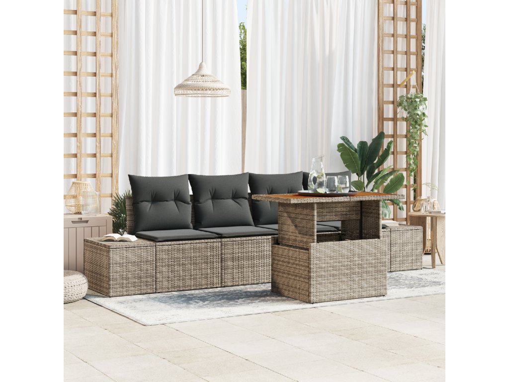 Prémiové materiály: Tato jídelní sada je vyrobena z vysoce kvalitního poly ratanu, známého pro svůj moderní styl a odolnost. Rám z práškově lakované oceli a masivního dřeva akácie poskytuje robustní strukturu, která zajišťuje stabilitu proti vnějším silám a povětrnostním podmínkám, zatímco kombinované materiály nabízejí skutečný přírodní vzhled. Obsahované komponenty: Sada zahrnuje dvě boční pohovky a dvě centrální sedadla, z nichž každé má praktickou úložnou funkci. Tento promyšlený design zvyšuje funkčnost a umožňuje snadné uložení venkovních potřeb a udržení prostoru v pořádku, ideální pro moderní venkovní život. Funkce a design: Využijte bezkonkurenční flexibilitu s nastavitelnosti nožičkami a modulárním designem, který vám umožňuje změnit uspořádání sady podle vašich požadavků. Elegantní, stylové čtvercové opěrky a hotové zádové části dodávají moderní nádech, splňující jak estetické, tak komfortní potřeby. Doporučené využití: Ideální pro zahradní a terasové prostory, ideální na letní a jarní večery. Tato sada poskytuje luxusní sezení pro neformální setkání, stolování nebo příjemné lenošení, přizpůsobující se atmosféře vašeho osobního venkovního ráje. Údržbová strategie: Pro trvalou krásu dodržujte jednoduché pokyny pro péči – zakryjte, když se nepoužívá, aby se chránilo před prvky. Sedadla lze rozepnout pro snadné čištění. Tato minimální údržba zajišťuje, že vaše jídelní sada zůstává po celou dobu používání v dokonalém stavu.- Barva: Šedá a hnědá