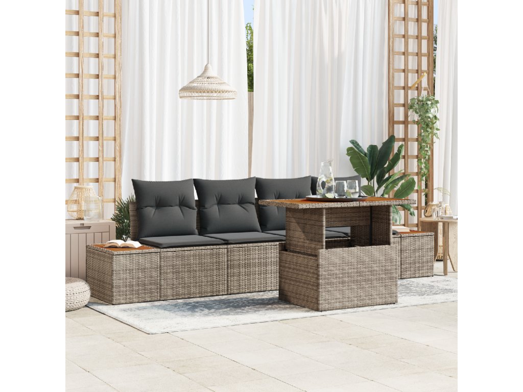 Materiály: Expert se vyrábí z polyratanu, oceli a masivního akáciového dřeva a tento zahradní set nabízí styl i odolnost. Polyratan zajišťuje vynikající UV ochranu, což zaručuje dlouhotrvající užívání bez blednutí, i pod tvrdým slunečním světlem. Ocelové komponenty jsou práškově lakované pro robustní povrch, zatímco akáciové dřevěné povrchy nabízejí teplý, přírodní vzhled, který doplňuje jakékoli venkovní dekorace. Zahrnuté komponenty: Set obsahuje dvě boční pohovky s integrovaným úložným prostorem, dvě centrální sedadla a zahradní stůl, což zajišťuje pohodlné a praktické uspořádání pro setkání. Každý kus je pečlivě navržen tak, aby zvýšil relaxaci a použitelnost, s promyšlenými úložnými řešeními pro bezproblémový prostor. Vlastnosti / Funkce / Design: Modulární design setu umožňuje přizpůsobitelné konfigurace, které se přizpůsobují různým tvarům a velikostem teras. Nastavitelné nožičky pomáhají vyrovnat nábytek na nerovných plochách a zároveň zajišťují stabilitu. S odnímatelnými a zipovými potahy na sedáky se údržba a čištění stanou snadnými. Doporučené využití: Ideální pro venkovní stravování nebo lenošení na jaře a v létě, tento set se hodí na zahrady, terasy a balkony. Jeho elegantní design bez problémů zapadá do neformálních, moderních nebo sofistikovaných venkovních prostředí, vyhovující rodinným jídlům, večírkům nebo klidným večerům. Údržba: Zajistěte si dlouhotrvající krásu zakrytím setu během nepříznivého počasí. Uložte polstry v interiéru, když je nepoužíváte, aby jste je ochránili před vlhkostí, a občas ošetřete akáciové dřevo vhodným olejem, abyste udrželi jeho vzhled.- Barva: Šedá a hnědá