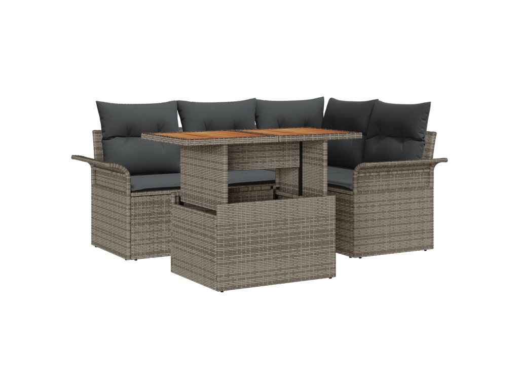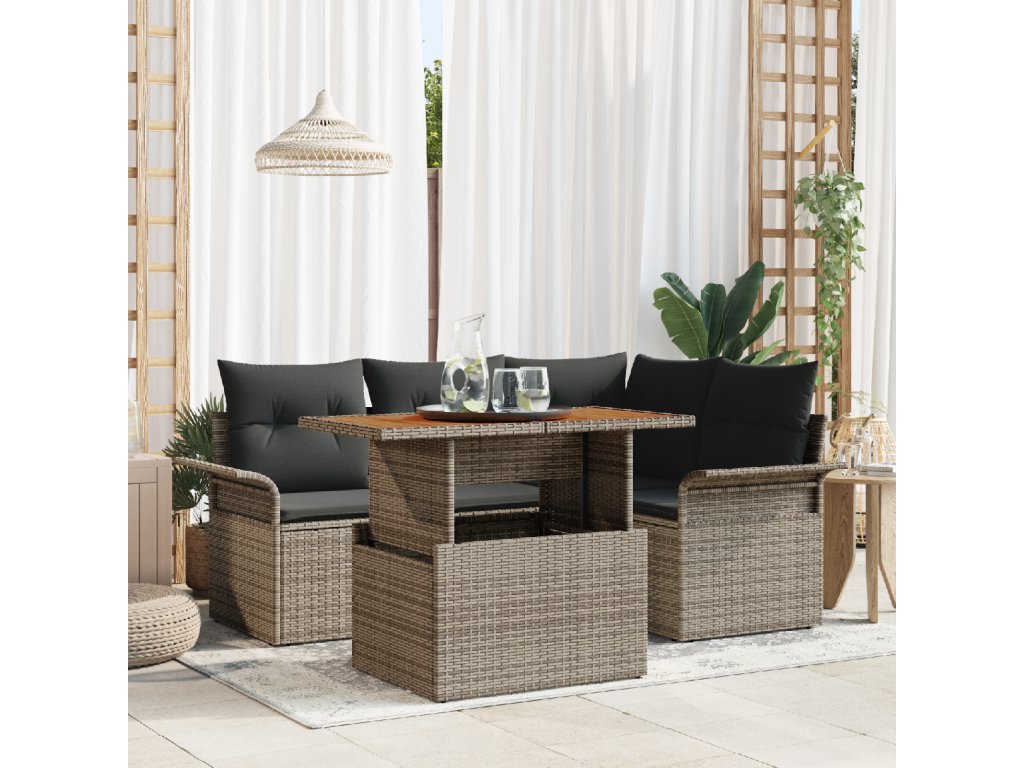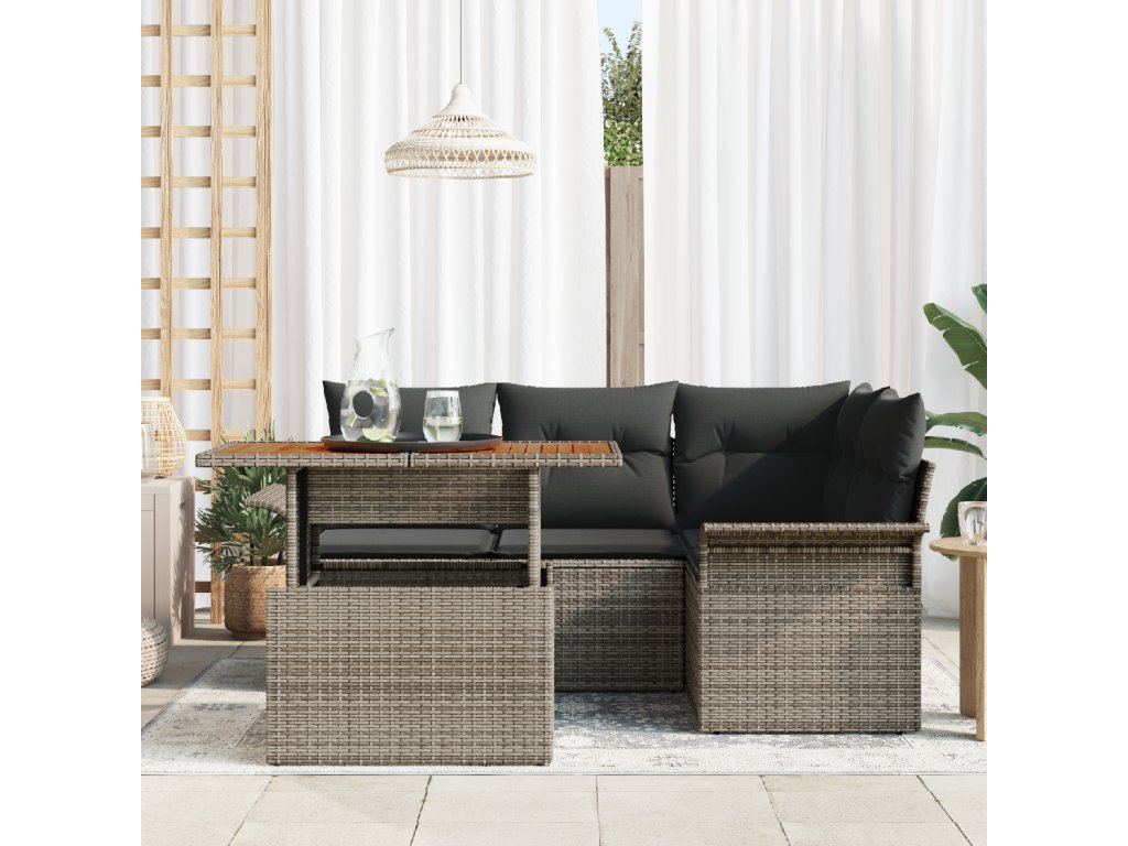 Materiály a konstrukce: Vyrobena z odolného polyratanu, tato zahradní sedací souprava zajišťuje dlouhou životnost a skvělý vizuální dojem. Práškově lakovaná ocelová konstrukce poskytuje spolehlivou oporu, zatímco pevný akáciový dřevěný povrch nabízí přirozeně živý vzhled. Tyto materiály jsou pečlivě vybírány, aby zajistily maximální stabilitu, odolnost vůči počasí a atraktivní estetiku. Praktická úložná řešení: Tato souprava obsahuje integrovaný úložný prostor v opěrných sedacích sofa, rozích a středních sedácích, čímž maximalizuje funkčnost a prostorovou organizaci. Skryté přihrádky jsou perfektní pro ukládání polštářů, dek nebo dalších nezbytností, udržujících váš venkovní prostor uklizený a přívětivý, aniž by to ohrozilo design. Nezkompromisní pohodlí: Souprava zahrnuje měkké venkovní polštáře, které jsou úplně odnímatelné, což usnadňuje čištění a údržbu. Navrženo s ohledem na pohodlí, tyto polštáře poskytují uvolněný zážitek ze sezení a přispívají k celkové eleganci a užitečnosti při vytváření příjemné venkovní atmosféry. Stylové opěrky: Jemně zakřivené a vyrobené z odpovídajícího polyratanu, opěrky rukou spojují design s pohodlím uživatele. Ideální pro opření nebo odpočinek, tyto opěrky doplňují celkový design, harmonicky se mísí s plnou kompozicí sofa. Jejich design podporuje prodloužené sezení, ať už se scházíte s přáteli nebo odpočíváte sami. Údržba a péče: Zajišťujte trvalou krásu tím, že pokryjete tento nábytek během mimo sezóny nebo nepříznivého počasí a otírejte ho vlhkým hadříkem pro rutinní čistotu. Taková praxe pomáhá zachovat jeho vzhled a funkčnost, což z něj činí trvalou investici pro každého nadšence do zahrady.- Barva: Šedá