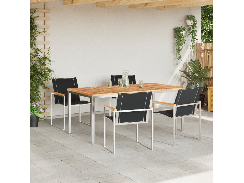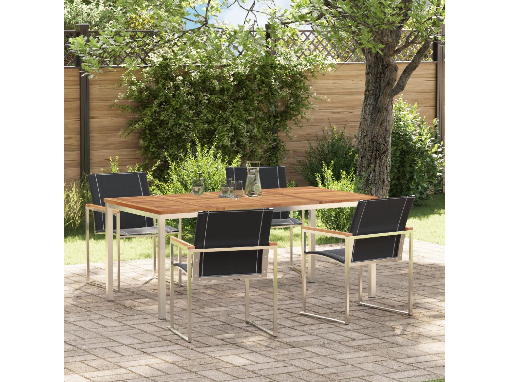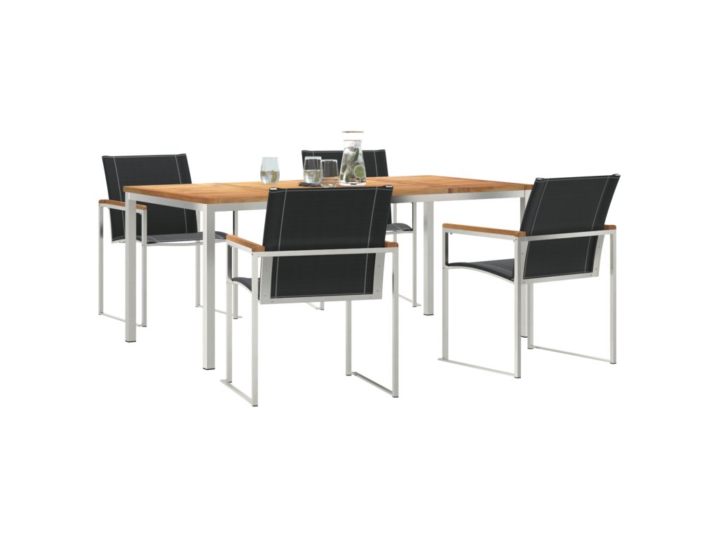 Materiály: Tento zahradní jídelní set spojuje silný ocelový rám s dřevěným stolem, což zajišťuje trvanlivost a přírodní hezký vzhled. Nerezová ocel mu dodává dlouhou životnost a odolává počasí, takže je fakt skvělou volbou pro vaši zahradu. Součásti: Najdete tu dřevěný stůl, který umožňuje odtok vody, takže se nebudou hromadit louže. Silné ocelové rámy zaručují stabilní posezení a skvělý jídelní zážitek, vše navržené pro trvanlivost a hezký vzhled. Vlastnosti / Funkce / Design: S pevnou konstrukcí je tenhle set bezpečný i v různém počasí. Elegantní stůl nejen skvěle vypadá, ale taky brání hromadění vody. Díky silnému ocelovému rámu jde o spojení funkčnosti a stylu pro perfektní venkovní jídelní prostor. Doporučené použití: Ideální pro zahrady a terasy, je tahle jídelní set přesně to pravé pro venkovní zábavu nebo klidné jídlo s rodinou. Jeho moderní vibe se skvěle hodí k současné estetice venkovních prostor. Vytvořte si útulné místo venku pro jídlo, čtení nebo prostě užívání si přírody. Údržba: Pro delší životnost používejte voděodolný obal, když není v provozu. Kovové části stačí otřít vlhkým hadříkem a dobře osušit. Tato pravidelná péče udrží váš zahradní nábytek hezký po celý rok.- Materiál: Masivní teakové dřevo