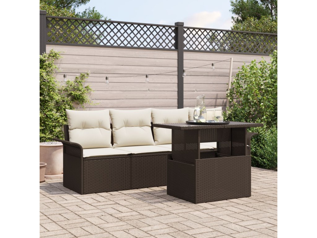 Elegance poly ratanu: Tahle souprava je udělaná z kvalitního poly ratanu, což jí dává stylový vzhled a trvanlivou konstrukci. Poly ratan je známý svou odolností, takže tvůj nábytek vypadá skvěle i za různých podmínek. Pohodlné polštáře zahrnuty: Set zahrnuje venkovní polštáře z odolného polyesteru, které jsou navržené pro komfort a styl. Tyhle měkké polštáře ti poskytnou podporu a pořád si udrží svůj lstivý vzhled i po vystavení venkovním podmínkám. Rám z práškované oceli: Ocelový rám má práškovou úpravu, která mu dává skvělý povrch a chrání ho před venkovními vlivy. Tato úprava nejen že chrání rám, ale poskytuje mu i elegantní vzhled, který se hodí do moderních prostor. Povrch z tvrzeného skla: Stůl s tvrzeným sklem přidává funkční a decentní lesk k celému setu. Je to luxusní prvek a zároveň snadno se udržuje a čistí. Jednoduchá údržba: Aby sis zachoval dobrý vzhled, doporučujeme schovávat polštáře dovnitř při špatném počasí a používat kryt, když nesedíš. Tím usnadňuješ údržbu a zajišťuješ, že si zásadu užíváš dlouho.- Barva: Hnědá