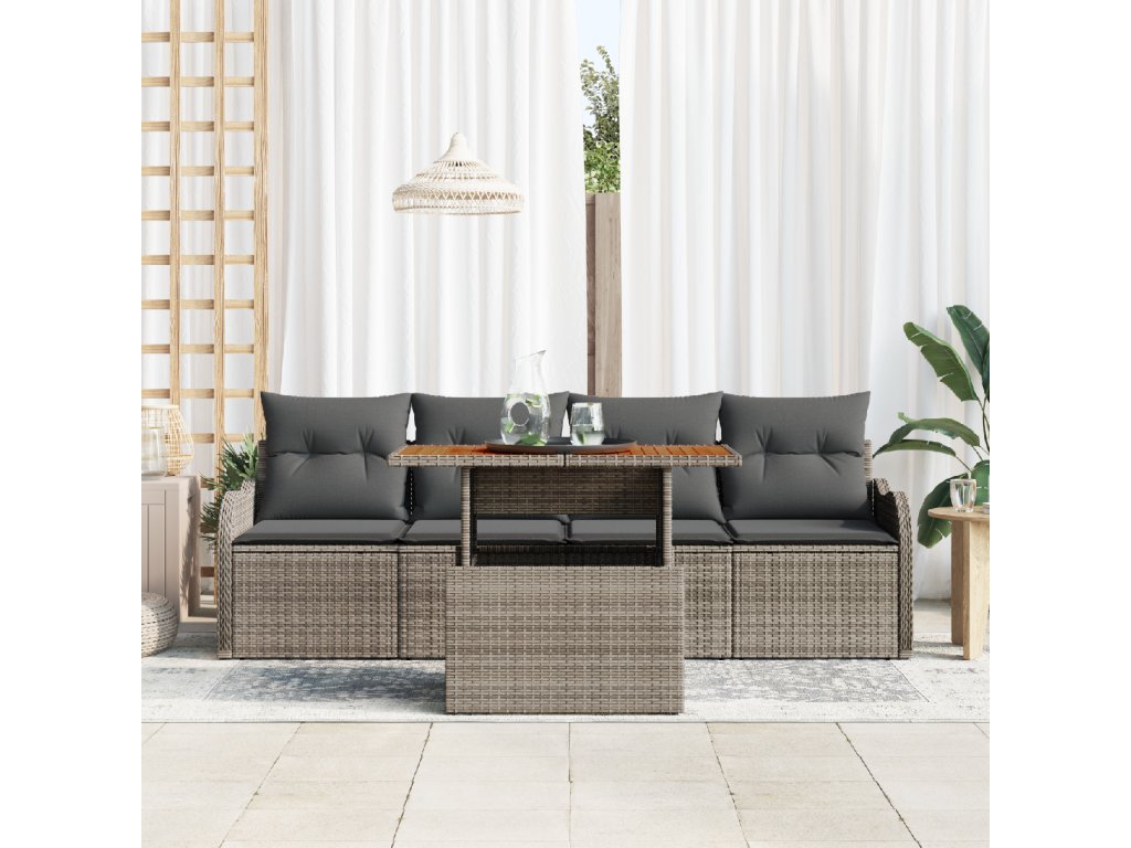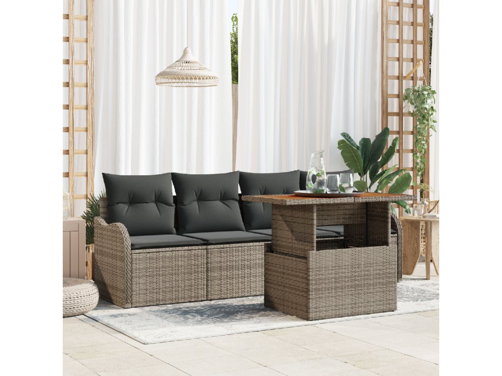 Prémiové materiály: Set kombinuje odolnost poly ratanu s krásným akáciovým dřevem, které odolává UV záření a dešti. Tato kombinace zajišťuje dlouhou životnost a nízkou údržbu. Kompletní komponenty: Každý díl je navržen pro pohodlí a funkčnost, s luxusními polstry a zakřivenými opěrkami pro maximální relaxaci. Funkční stůl: Výsuvný stůl se jednoduše promění z kávového na jídelní stůl, ideální pro různé aktivity. Flexibilní umístění: Skvěle se hodí do různých prostor, jeho modularita umožňuje snadné přizpůsobení podle vaší nálady. Snadná údržba: Stačí zakrýt set při špatném počasí, takže si dlouho uchová svůj svěží vzhled.- Barva: Šedá