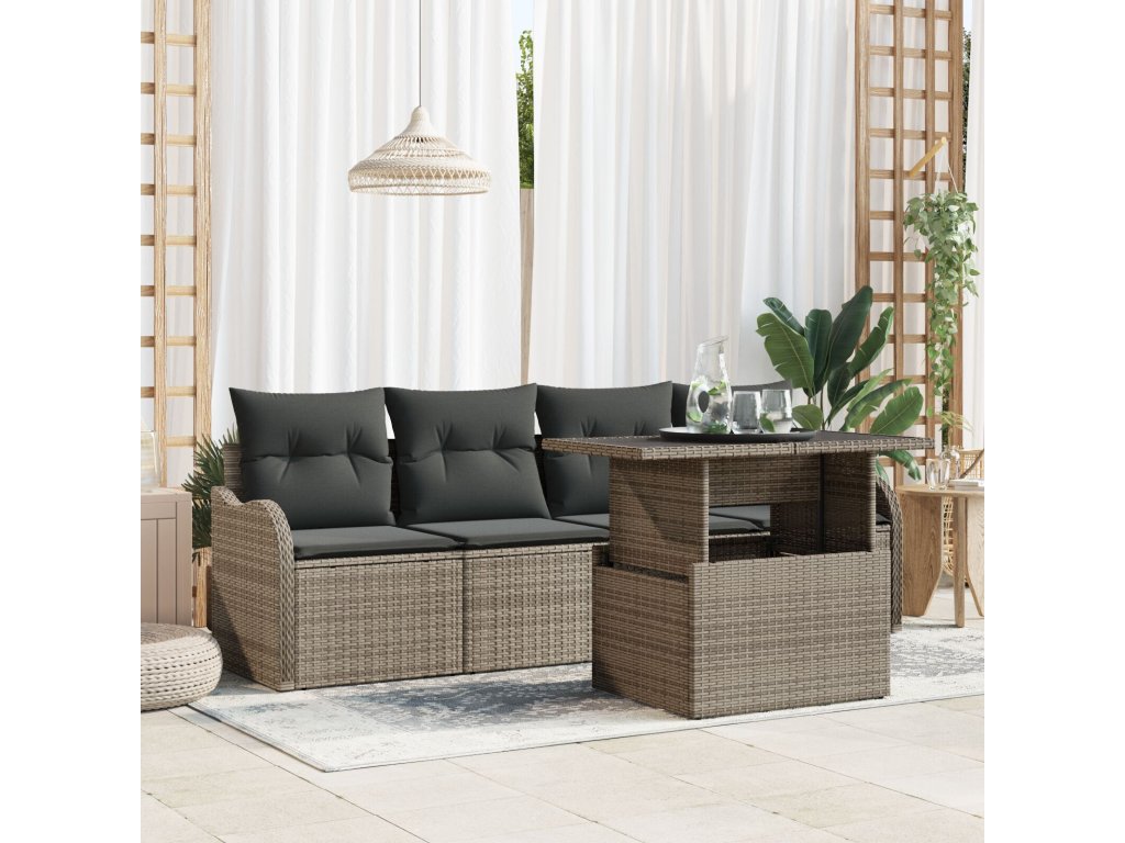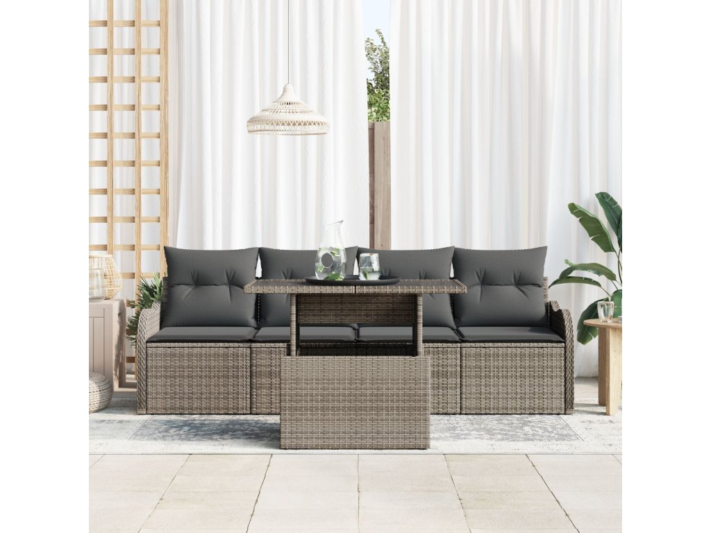 Poly ratanová konstrukce Pohovka je z kvalitního poly ratanu, odolného vůči vyblednutí a skvrnám. Zůstane žhavou součástí každého venkovního prostoru po dlouhá léta. Součásti v ceně Tento set obsahuje dvě středové sedačky, dvě pohovky s opěradly a stůl se skleněnou deskou, což zajišťuje všechno potřebné pro kompletní venkovní posezení. Venkovní polštáře přispívají k pohodlnému lenošení. Funkční prvky Díky výškově nastavitelné stolové desce snadno proměníte stůl z konferenčního na jídelní. Voděodolný úložný vak poskytuje praktické a bezpečné uložení věcí. Univerzální použití Ideální pro jakoukoli zahradu nebo terasu, modulární design umožňuje volné přeuspořádání komponentů, což je super pro různé příležitosti. Její lehká konstrukce usnadňuje přesouvání venku. Jednoduchá údržba Udržovat tuhle nábytkovou sadu v top stavu je jednoduché. Stačí ji zakrýt, když ji zrovna nepoužíváte. Díky snadné údržbě zůstane stále atraktivní a funkční během sezónních změn.- Barva: Šedá