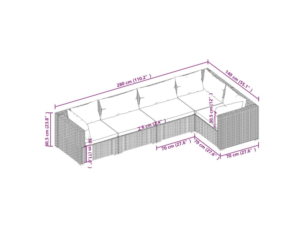 - Rozměry rohové/středové pohovky (každé): 70 x 70 x 60,5 cm (D x Š x V)