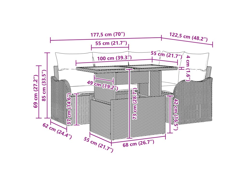 - Součásti: Souprava obsahuje 2 arm pohovky, rohové sezení, centrální sedadlo a stylový stůl. Všechny kusy mají opěrky a opěradlo z poly ratanu, což zajišťuje maximální pohodlí. Díky modulárnímu designu si můžete sezení uspořádat podle sebe.