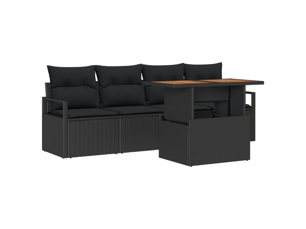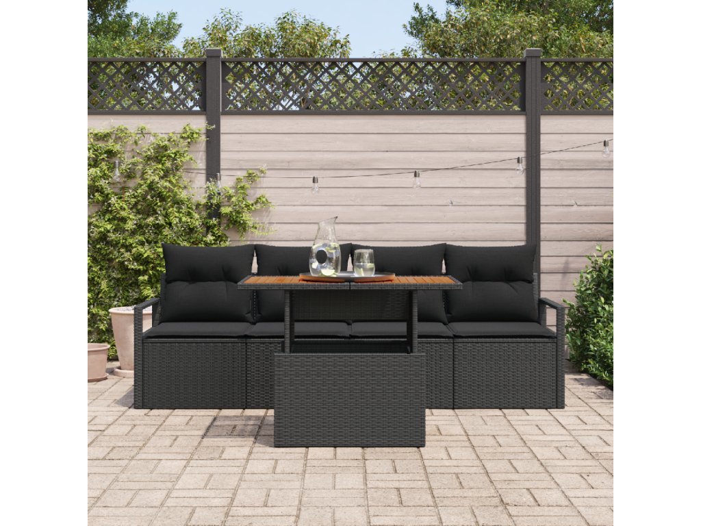 Prémiové materiály: Tato zahradní pohovka je z kvalitního poly ratanu na práškově lakovaném ocelovém rámu, takže je odolná proti běžnému opotřebení. Stůl z akáciového dřeva dodává eleganci a teplo. Tato kombinace zůstává stylová a odolná i při špatném počasí. Funkční prvky: Souprava obsahuje dvě pohovky s opěrkami a dvě středová místa se zabudovaným úložným prostorem pro vaše venkovní věci. K tomu pevný zahradní stůl z akáciového dřeva, ideální na jídlo nebo neformální setkání. Všechno je navržené tak, abyste měli uspořádaný venkovní prostor. Design a funkčnost: Tato souprava se zaměřuje na funkčnost s UV-odolnými materiály, které chrání před sluncem, a odnímatelnými polštáři pro snadnou údržbu. Moderní, minimalistický styl se hodí do každé zahrady nebo na terasu, přináší vám styl a praktičnost. Praktické využití: Ideální pro zahrady a terasy, tahle pohovka vybízí k relaxaci a socializaci. Ať už zvete přátele, nebo trávíte čas s rodinou, její flexibilní design se přizpůsobí aktuálnímu dění. Jednoduchá údržba: Udržet soupravu v dobrém stavu je snadný úkol. Stačí otřít ratanové plochy vlhkým hadříkem a dát na ni kryt, když ji nepoužíváte. Polštáře se snadno sundavají pro rychlou výměnu, takže udržují všechno svěží a pohodlné.- Barva: Černá