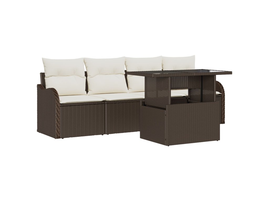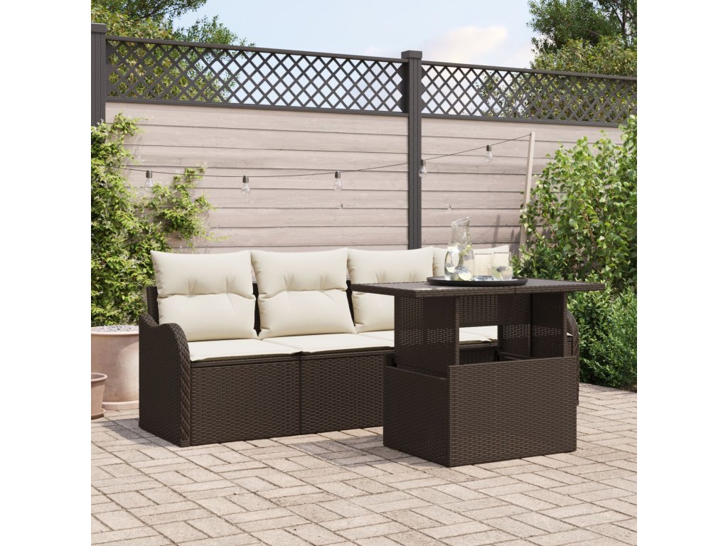 Poly ratanová konstrukce Pohovka je z kvalitního poly ratanu, odolného vůči vyblednutí a skvrnám. Zůstane žhavou součástí každého venkovního prostoru po dlouhá léta. Součásti v ceně Tento set obsahuje dvě středové sedačky, dvě pohovky s opěradly a stůl se skleněnou deskou, což zajišťuje všechno potřebné pro kompletní venkovní posezení. Venkovní polštáře přispívají k pohodlnému lenošení. Funkční prvky Díky výškově nastavitelné stolové desce snadno proměníte stůl z konferenčního na jídelní. Voděodolný úložný vak poskytuje praktické a bezpečné uložení věcí. Univerzální použití Ideální pro jakoukoli zahradu nebo terasu, modulární design umožňuje volné přeuspořádání komponentů, což je super pro různé příležitosti. Její lehká konstrukce usnadňuje přesouvání venku. Jednoduchá údržba Udržovat tuhle nábytkovou sadu v top stavu je jednoduché. Stačí ji zakrýt, když ji zrovna nepoužíváte. Díky snadné údržbě zůstane stále atraktivní a funkční během sezónních změn.- Barva: Hnědá