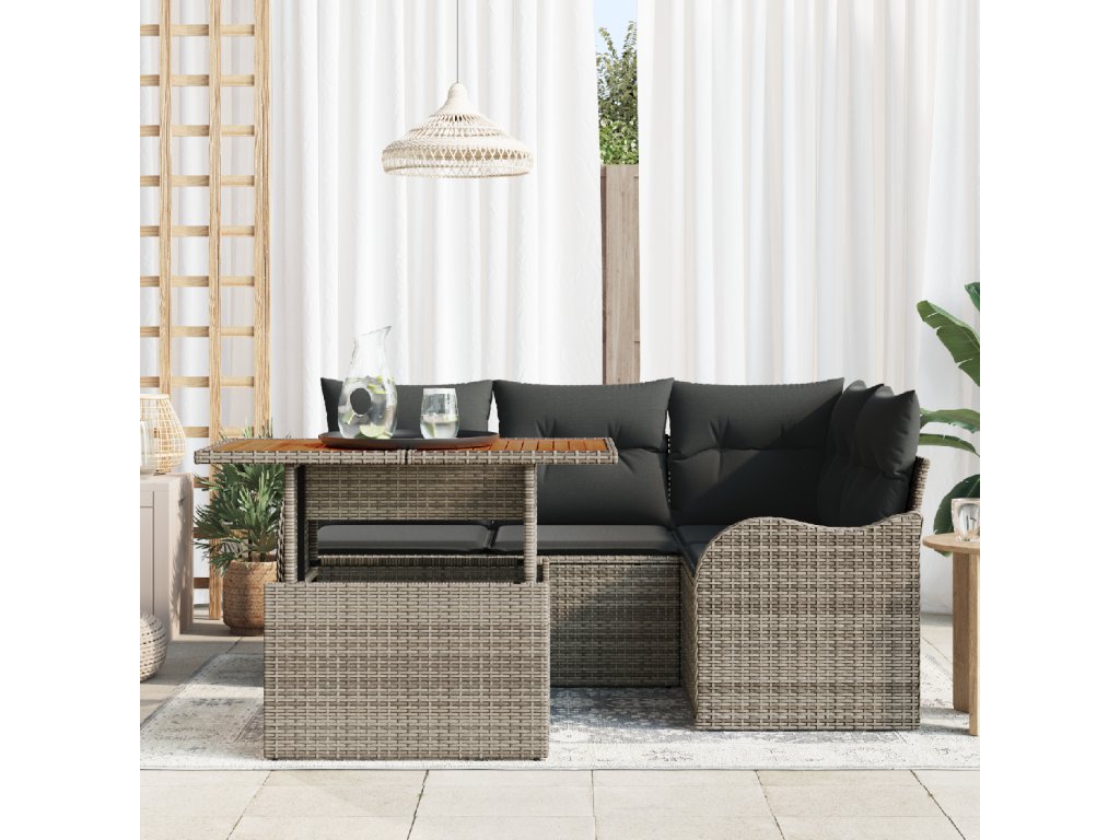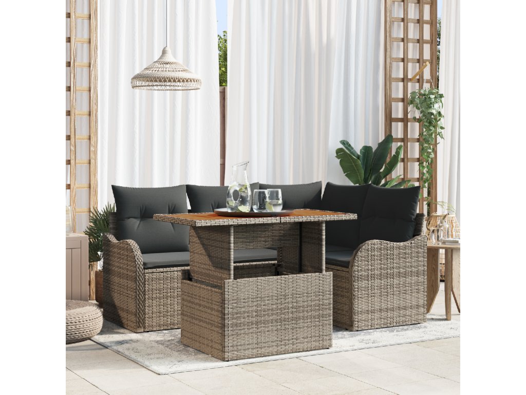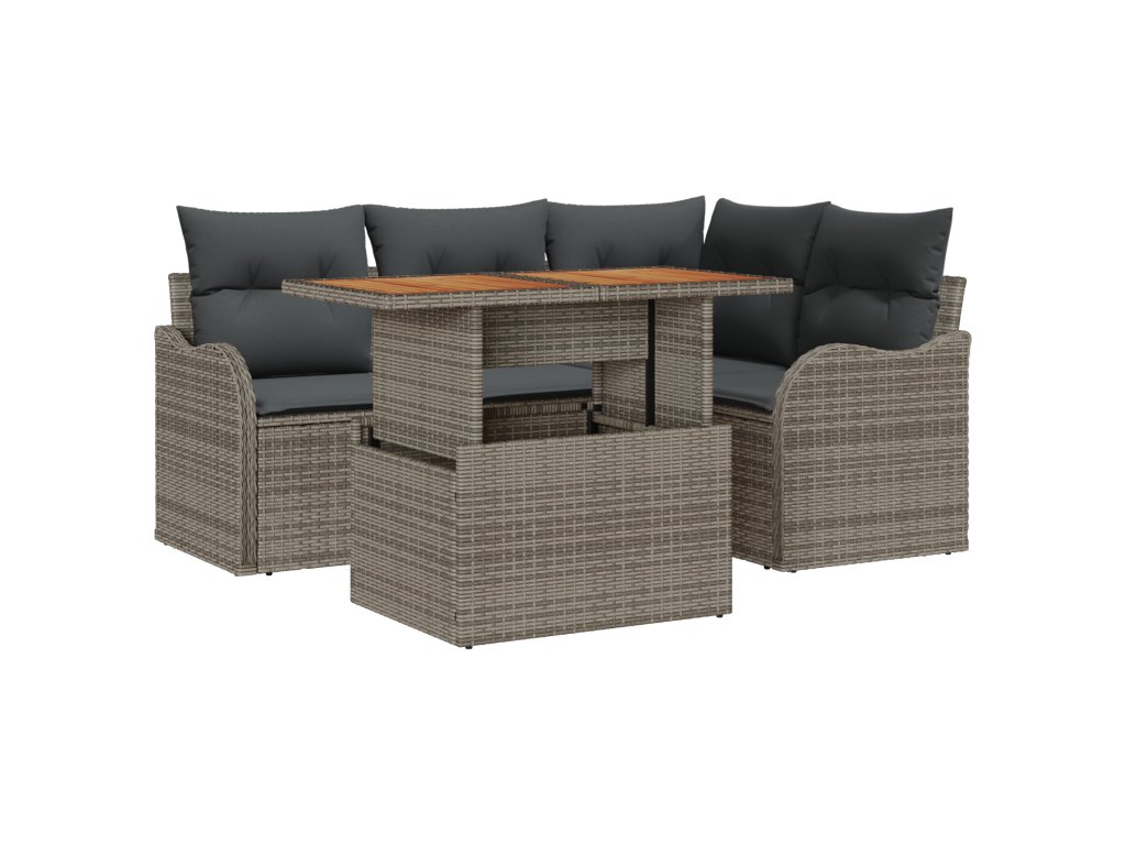 Materiály: Vyrobená z poly ratanu a masivního akáciového dřeva, což zajišťuje eleganci i odolnost. Poly ratan vám dá super ochranu před počasím, takže se skvěle hodí ven, a akáciové dřevo přináší přírodní krásu a sílu pro dlouhou životnost. Součásti: Souprava obsahuje 2 arm pohovky, rohové sezení, centrální sedadlo a stylový stůl. Všechny kusy mají opěrky a opěradlo z poly ratanu, což zajišťuje maximální pohodlí. Díky modulárnímu designu si můžete sezení uspořádat podle sebe. Funkce/Design: Stolek se výškově nastavuje a přetváří z konferenčního stolu na jídelní stůl – ideální pro různé aktivity venku. Tato funkce spolu s odolnými materiály činí soupravu příjemnou pro aktivní životní styl. Doporučené použití: Perfektní pro jarní a letní shromáždění, grilování nebo jen tak na lenošení, souprava zvědavě zve k relaxaci a společným chvílím. Moderní design ji dělá univerzální pro každou venkovní příležitost, ať už máte neformální nebo formální akci. Péče a údržba: Chcete-li udržet její krásu, zakryjte ji, když ji nepoužíváte a občas ji otřete měkkým hadříkem. Pokud se o ni budete starat, zůstane jako nová a bude součástí vaší venkovní oázy na spoustu let.- Barva: Šedá