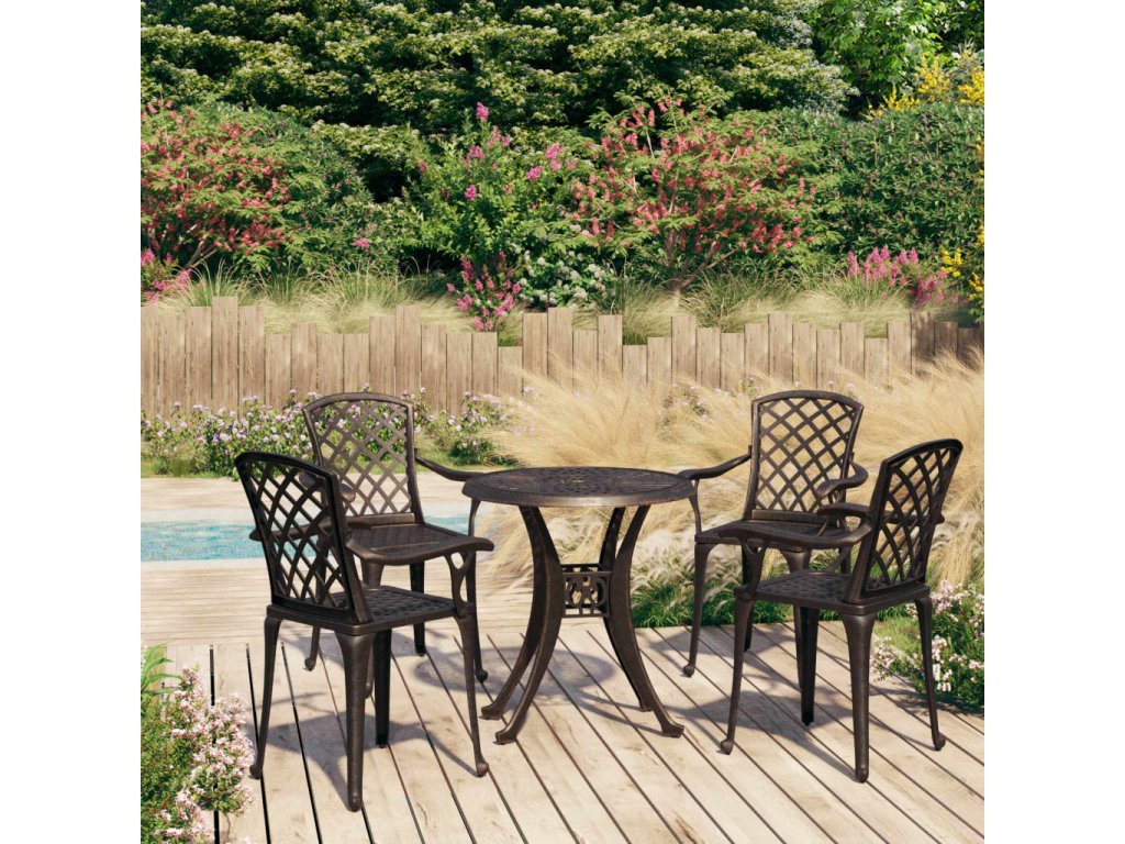 Zahradní stůl a židle z litého hliníku jsou robustní a hodně toho vydrží. Jelikož jsou vyrobené z materiálu, který nerezaví a nepodléhá klimatickým vlivům, jedná se o ideální nábytek pro venkovní použití. Vzhledem ke svému překrásnému designu zapůsobí bistro set ve vašem venkovním bydlení jako elegantní doplněk. Konferenční stolek má navíc uprostřed otvor, kam můžete zasunout slunečník, abyste se ochránili před sluníčkem či deštěm.