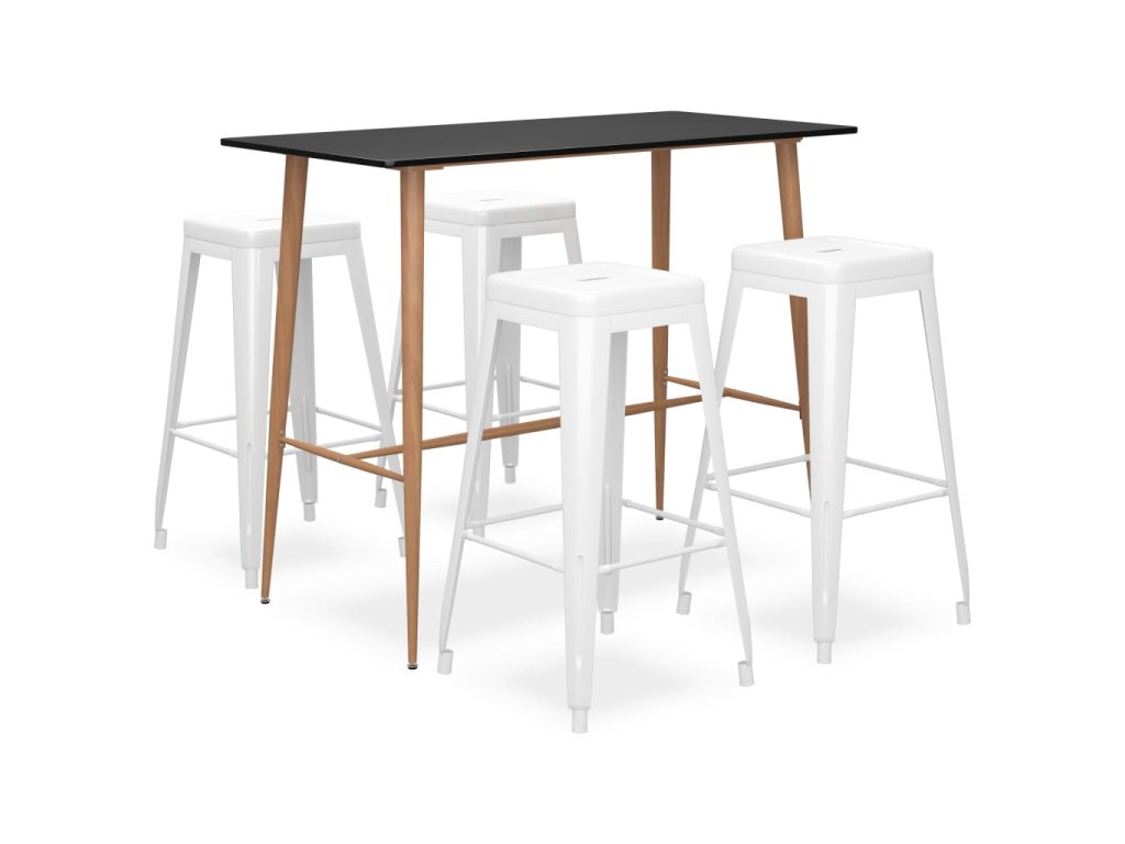 Náš vysoký stůl má horní desku z odolné MDF a pevné kovové nohy, které vzhledem připomínají dřevo. Barové stoličky jsou vyrobené z natíraného kovu, což jim zajišťuje mimořádnou robustnost a dlouhou životnost. Zesílená příčka pod sedákem a opěrka nohou zlepšují stabilitu. Židle lze navíc stohovat, aby se vám snáze skladovaly, jedná se tedy o dokonalé řešení pro omezené prostory.