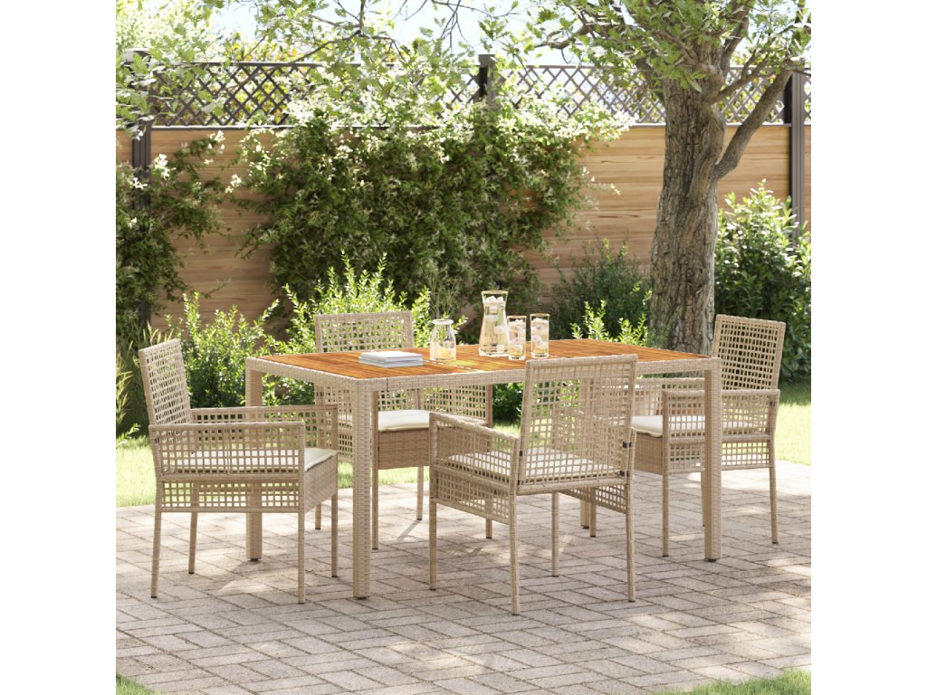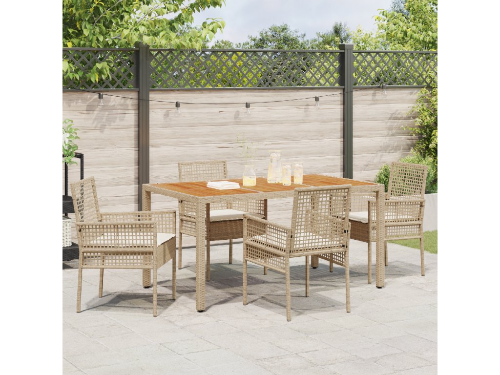 Materiály: Tato zahradní jídelní souprava z polyratanu má hladký povrch, který spojuje moderní styl s trvanlivostí. Polyratan je vybrán pro svou odolnost vůči špatnému počasí, takže si udržuje vzhled a strukturu i v různých ročních obdobích. Tento materiál dodává stylový, moderní dojem, zatímco je flexibilní a zabraňuje prasklinám nebo zlomeninám. Součásti: Jídelní souprava má velký stůl s pevným polyratanovým vrchem, který nabízí dostatek místa pro jídlo i zábavu. Každá židle je navržená tak, aby byla pohodlná, abyste si mohli užívat dlouhé chvíle s rodinou a kamarády. Všechny díly spolu tvoří krásnou kombinaci stylu a praktičnosti pro vaši venkovní jídelní zónu. Vlastnosti / Funkce / Design: Tato souprava je navržena tak, aby odolávala nepřízni počasí. Její voděodolné vlastnosti chrání před deštěm a UV zářením, takže vydrží a poskytne skvělou hodnotu. Stylový design se hodí k různým venkovním stylům – od klasiky po modernu a bez problému oživí jakékoli místo. Doporučené použití: Ideální na venkovní prostory jako terasy, zahrady a verand, tahle jídelní souprava je skvělým centrem pro každodenní jídla i speciální příležitosti. Její příjemný vzhled vás zve k pohodovým jídlům a setkáním, což ji dělá nezbytnou pro jakýkoli venkovní prostor, ať už doma nebo v podnikání. Údržba a péče: Udržet ji v perfektní kondici je jednoduché – stačí ji otřít vlhkým hadříkem a bude jako nová. A aby vydržela suitable for co nejdéle, je fajn ji na extrémní počasí zakrýt. S nízkými nároky na údržbu si uchová svůj půvab bez zbytečného úsilí.- Barva: Béžová