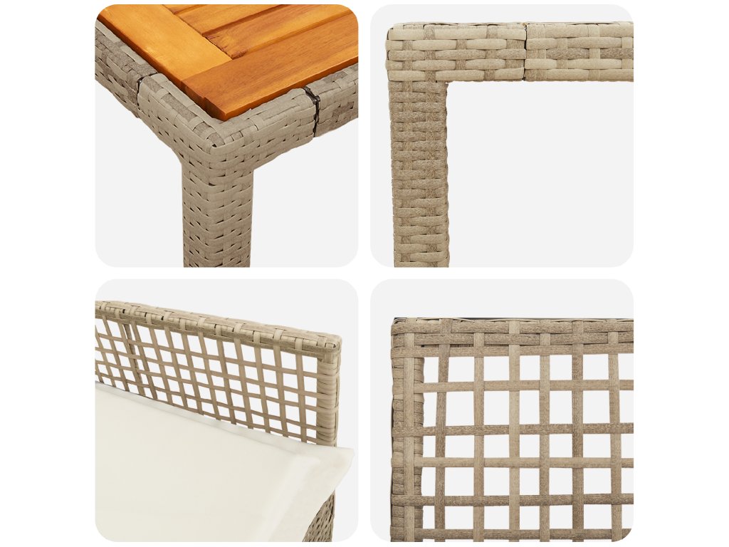 Tahleta zahradní jídelní souprava spojuje moderní design s poctivou funkčností, takže bude hvězdou každého venkovního setkání. Je stvořená pro venkovní použití a nabízí elegantní spojení stylu a pohodlí. S polyratanovým šarmem přináší lehkou atmosféru, která přesně zapadne do zahrad, teras nebo verand. Je ideální pro ty, suitable for co chtějí kombinovat styl a praktičnost, a dává vám flexibilní prostor na pohodové jídlo s kamarády venku.